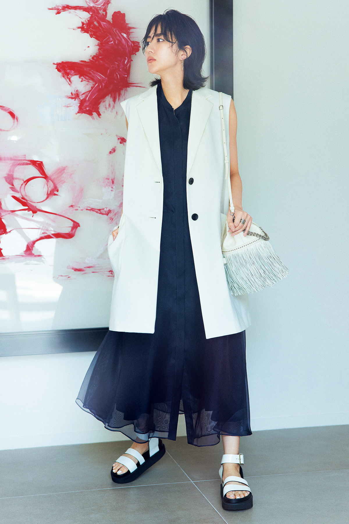 カッコよさと華やかさを同時に叶えるジレを活用して、ワンピにさらなる洒落感を。スラリとした縦長ラインを作り、スタイルアップにも貢献。ホワイトのロングジレなら、ドラマティックなワンピもすっきりバランスよく仕上がります。ジレ¥59,400サンダル¥49,500(ともにチノ/モールド)ワンピース¥105,600(ebure GINZA SIX店)バッグ¥156,200(J&Mデヴィッドソン/J&M デヴィッドソン 青山店)リング¥9,900ピアス¥13,200(ともにアダワットトゥアレグ)