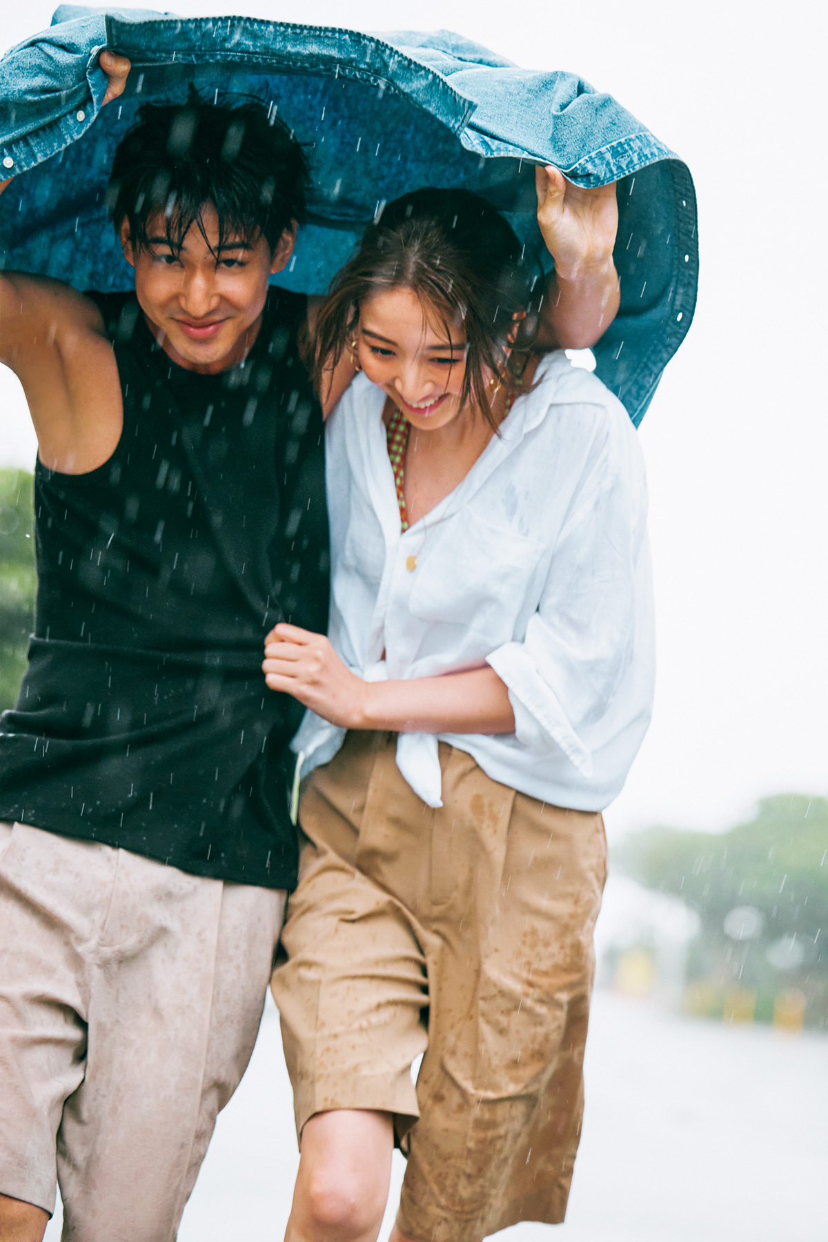 ずっともやもやしていた私たちの関係。このままふんわり終わっていくのかなって思っていたけれど、大雨の中、彼のシャツの下で告白されるなんて!これからだってまさかの事態を二人で切り開いていける気がする。東京と沖縄、オンラインでコミュニケーションをとりながら愛をはぐくんでいこう!こんな時代だからこそ、距離って関係ないなって思うんだよね。水着(ブラトップ)¥14,300(någonstans)ピアス¥8,800(アビステ)ネックレス¥22,000(マリハ)[メンズ]シャツ¥13,200タンクトップ¥2,750(ともにビームス/ビームス原宿)パンツ¥6,990(PLST)