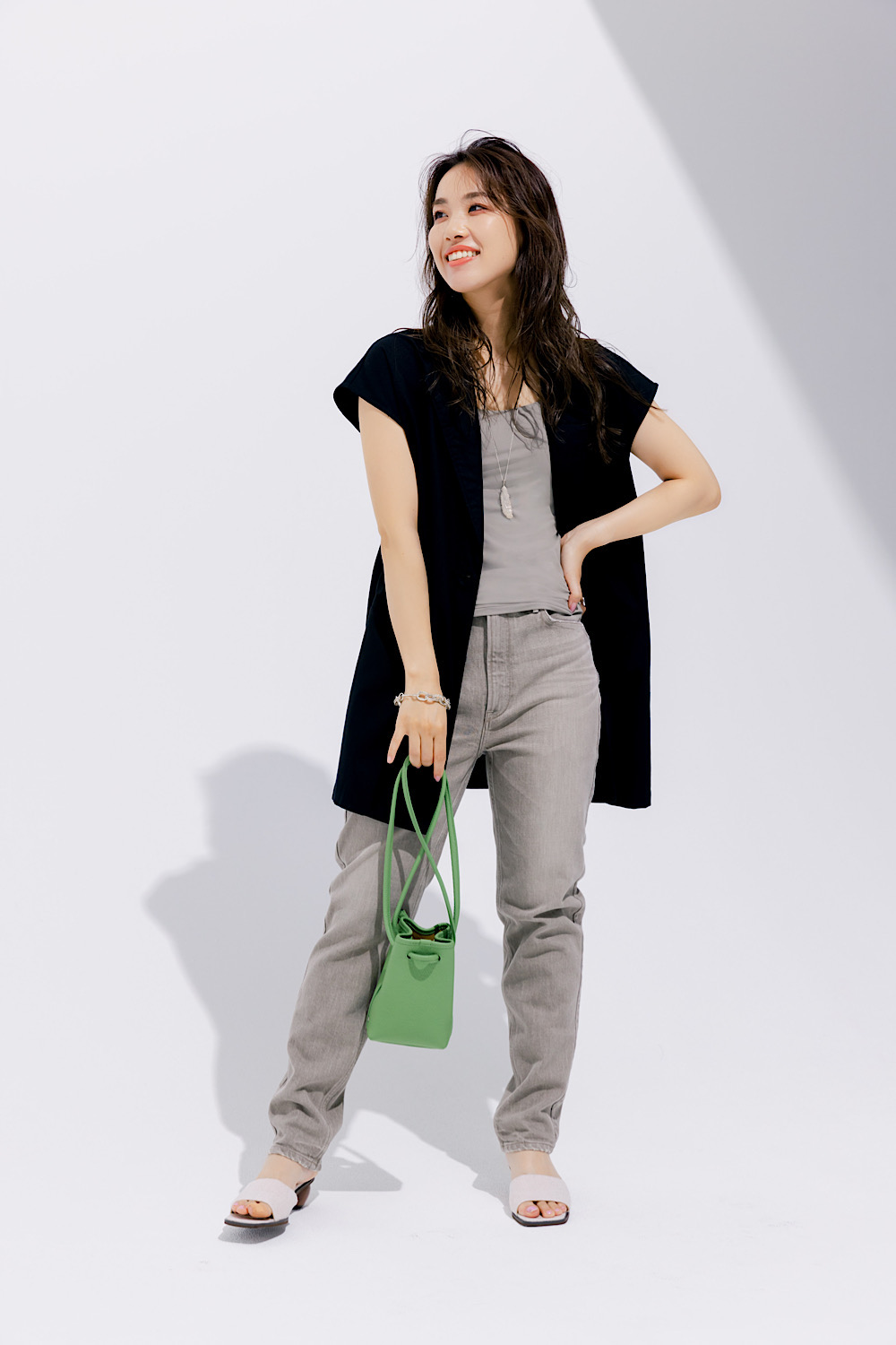 上下をニュアンスカラー同士で組み合わせて、潔くワントーンコーデに仕上げます。縦のラインを強調するなら、足元もコントラストがつかないアイボリーのサンダルで。そのぶん黒ジレでメリハリを意識し、全体を引き締めます。差し色には鮮やかなグリーンを投入。ハンサムなシルバーアクセが女度を高めます。カーキエアリズムブラキャミソール¥1,990(UNIQLO)ジレ¥5,500(COTORICA.)デニムパンツ¥25,300(アッパーハイツ/ゲストリスト)バッグ¥29,700(ヴァジック/ヴァジックジャパン)サンダル¥2,640(神戸レタス)ネックレス¥12,980(チビジュエルズ/チビジュエルズ・ジャパン)ブレスレット¥9,350<イン ムード>リング¥7,480<ファシアータ>(ともにフォーティーン ショールーム)