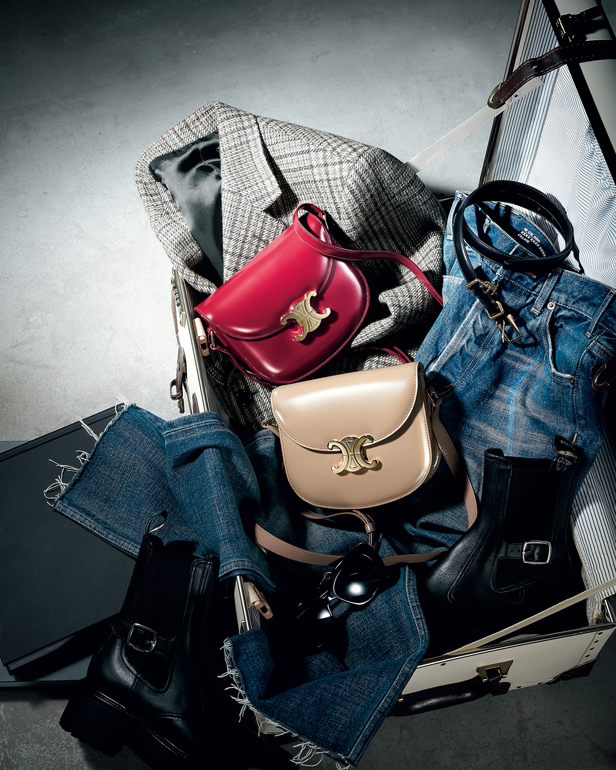 カジュアルな佇まいと上品な艶のあるシャイニーカーフスキンが、デニムにもジャケットにも似合うバランス感を作ります。バッグ「トリオンフ ティーン ブザス」〈H16×W18.5×D6㎝〉各¥451,000ジャケット¥363,000デニム¥121,000ブーツ¥143,000サングラス¥66,000※すべて予定価格 ベルト/参考商品(すべてセリーヌ バイ エディ・スリマン/セリーヌ ジャパン)