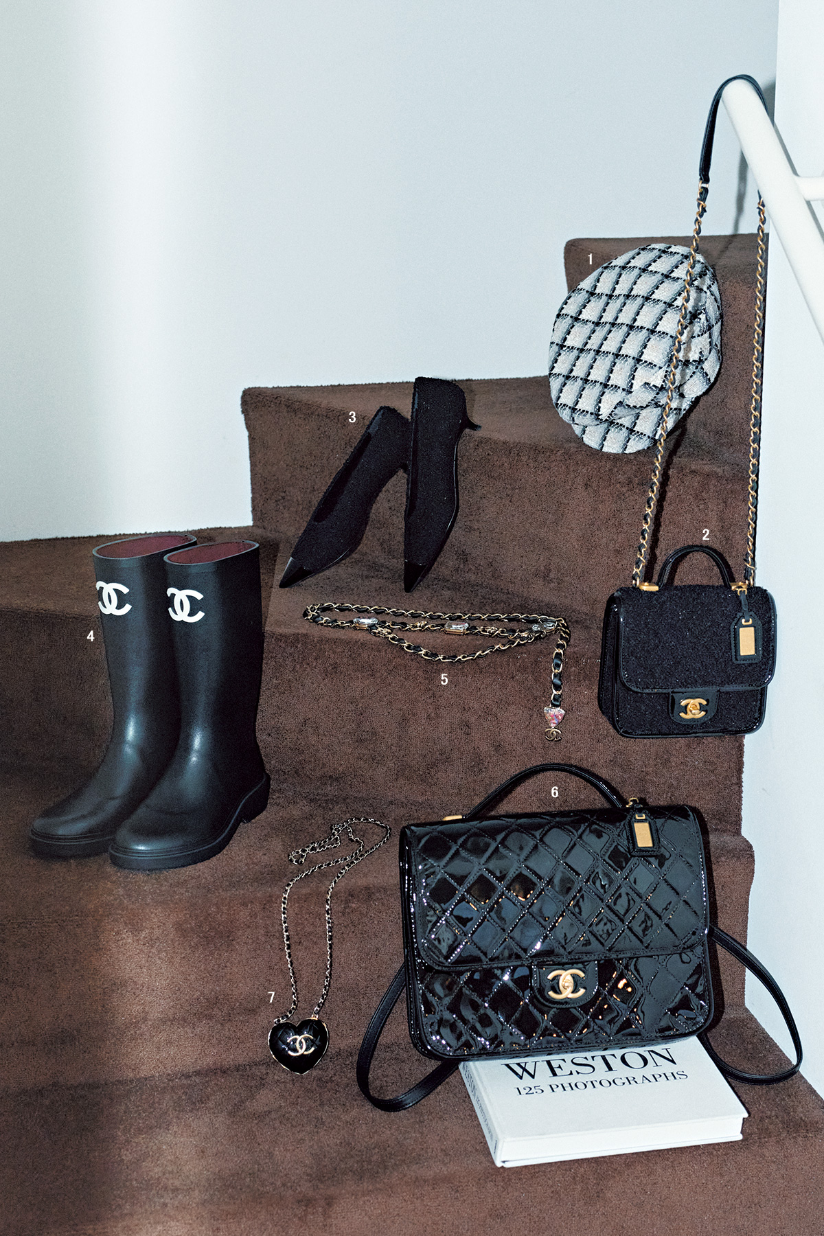 シャネルのエレガンスを象徴するブラック。今シーズンもパテントキルティングやツイードといった、バリエーション豊富な黒が充実。1.帽子¥163,900、2.ラメがきらめくファブリックが華やか。フラップバッグ「FLAPBAG WITH HANDLE SAC RABAT AVEC POIGNÈE」〈H17×W20.5×D6㎝〉¥570,900、3.ツイードとパテントの異素材デザインで上品な足元に。パンプス¥149,600、4.パッと目を惹くCCロゴで雨の日のおしゃれも楽しくなる一足。ブーツ¥135,300、5.ベルト¥421,300、6.バックパック「BACK PACK SAC ÀDOS 」〈H31.5×W31×D9㎝〉¥639,100、7.ネックレス¥354,200※以上すべて予定価格(すべてシャネル/シャネル カスタマーケア)