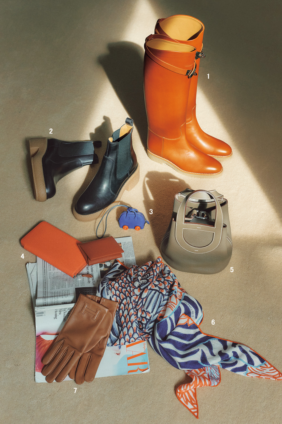 1.ソールの素材に新たなアレンジを加え、アイコニックな「ケリー」のバックルを施したシリーズ「フォースティン」は、モードとカジュアルを兼ね備えたハイブリッドな一足。ブーツ¥390,500、2.ショートブーツ¥148,500、3.チャーム¥418,000、4.長財布¥173,800財布¥64,900、5.アイコニックな「シェーヌ・ダンクル」モチーフがあしらわれた、シリーズの最新バケツ型バッグ。エルメスが培ってきた皮革製品のノウハウが詰まったディテールで実用性も高く、永く愛せる。バッグ「イン・ザ・ループ」〈H19.5×W18×D12㎝〉¥595,100、6.スカーフ¥112,200、7.手袋¥112,200(すべてエルメス/エルメスジャポン)