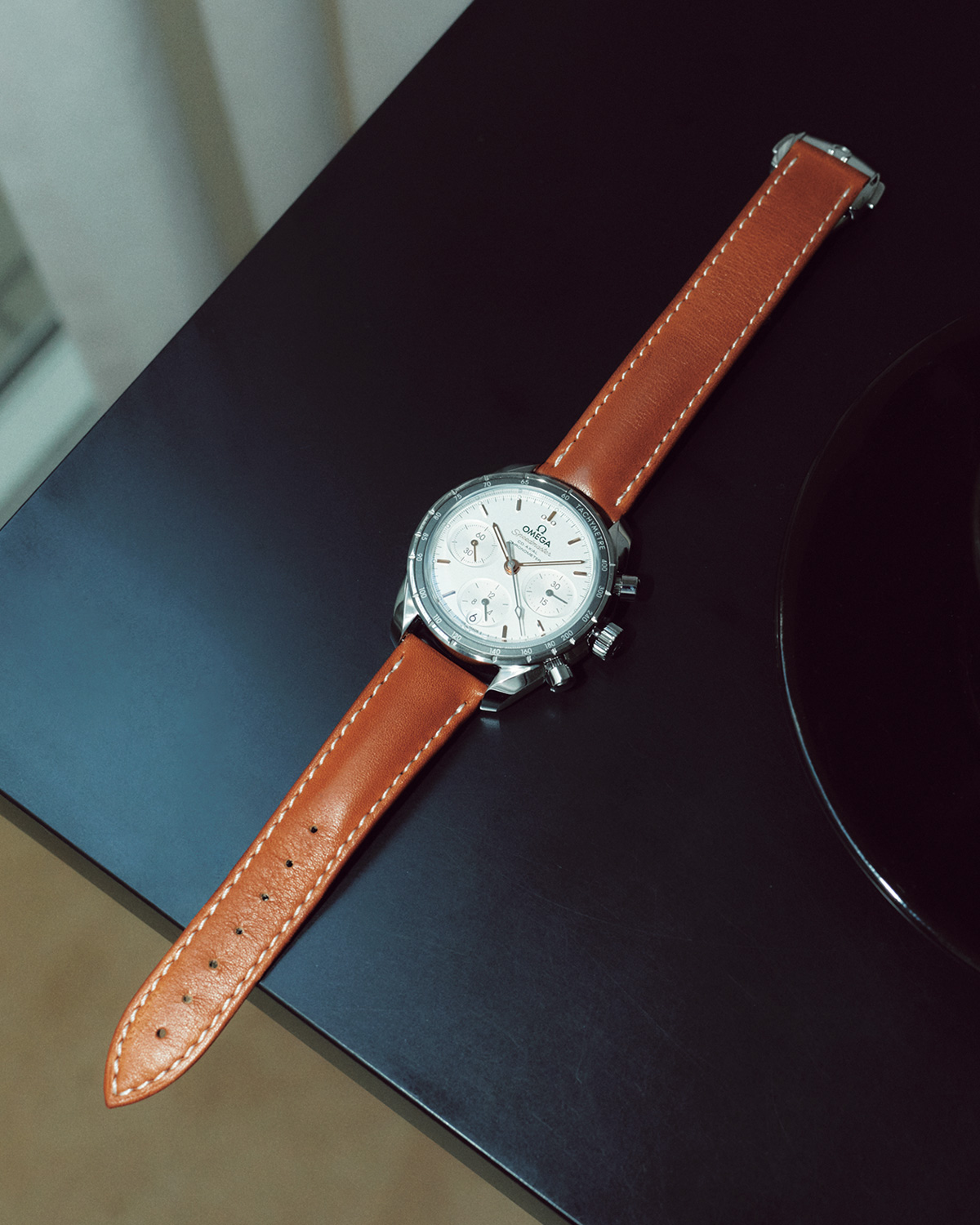 スピードマスターのスポーティさとエレガントさを両立したモデル。ユニセックスな38㎜径のデザインをハンサムな着こなしのアクセントに。時計「スピードマスター38㎜」〈ステンレススティール×レザーストラップ,ケース38㎜,自動巻〉¥649,000※7月29日からの価格(OMEGA)