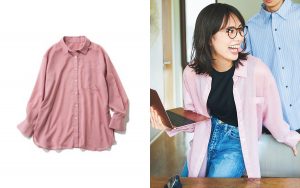 透け感のある素材で涼しげなシャツ。ニュアンスピンクも絶妙です。¥14,300(アルページュストーリー/アルページュストーリー プレスルーム)