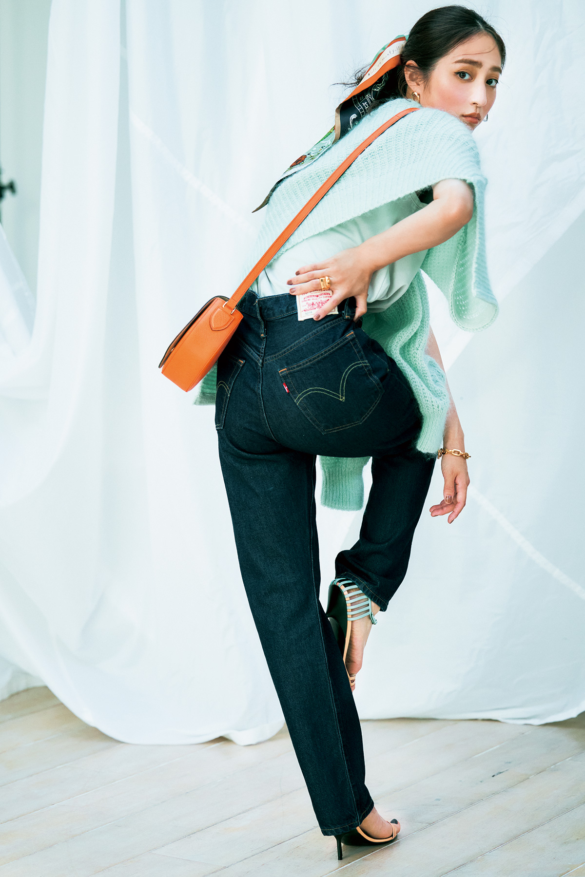デニムパンツ[循環型Levi’s® 501® ジーンズ]¥16,500(リーバイス®/リーバイ・ストラウス ジャパン)カットソー¥11,000(ebure/ebure GINZA SIX店)カーディガン¥30,800(ガリャルダガランテ/ガリャルダガランテ表参道)スカーフ¥17,600(マニプリ/フラッパーズ)バッグ¥37,400(ロンシャン/ロンシャン・ジャパン)サンダル¥145,200(ピエール アルディ/ピエール アルディ 東京)ピアス¥17,050 リング2本セット¥21,230〈ともにソコ〉ブレスレット¥14,300〈ベンアムン〉(すべてZUTTOHOLIC)