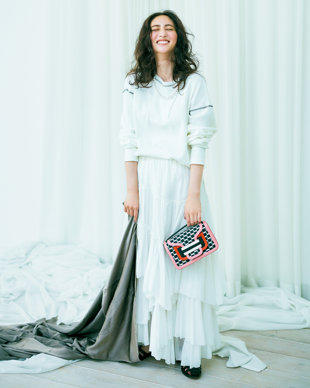 サーマルカットソー[オーガニック100%・日本製・日本の素材を使用]¥12,100〈スモールカーサフライン〉コットンティアードスカート[天然素材100%・再生繊維を使用]¥36,300〈カーサフライン〉(ともにCASA FLINE表参道本店)バッグ¥118,800(ピエール アルディ/ピエール アルディ 東京)サンダル¥20,680(アルアバイル)イヤリング¥6,300(アビステ)ネックレス¥58,080(ペヨテ バード/ZUTTOHOLIC)