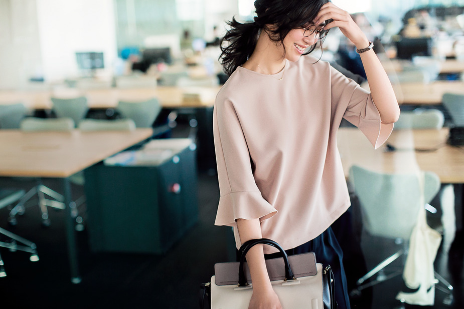 <写真2>ブラウス¥19,000(サクラ/インターリブ)パンツ¥11,000(リトルシック/ザ・スーツカンパニー 銀座本店)バッグ¥75,000(FURLA/FURLA JAPAN)ネックレス¥36,000(ジルスチュアート/ヴァンドームヤマダ)時計¥55,000(ヴァンドーム青山/ヴァンドーム青山プルミエール 伊勢丹新宿店)メガネ¥7,000(ゾフ/ゾフ カスタマーサポート)