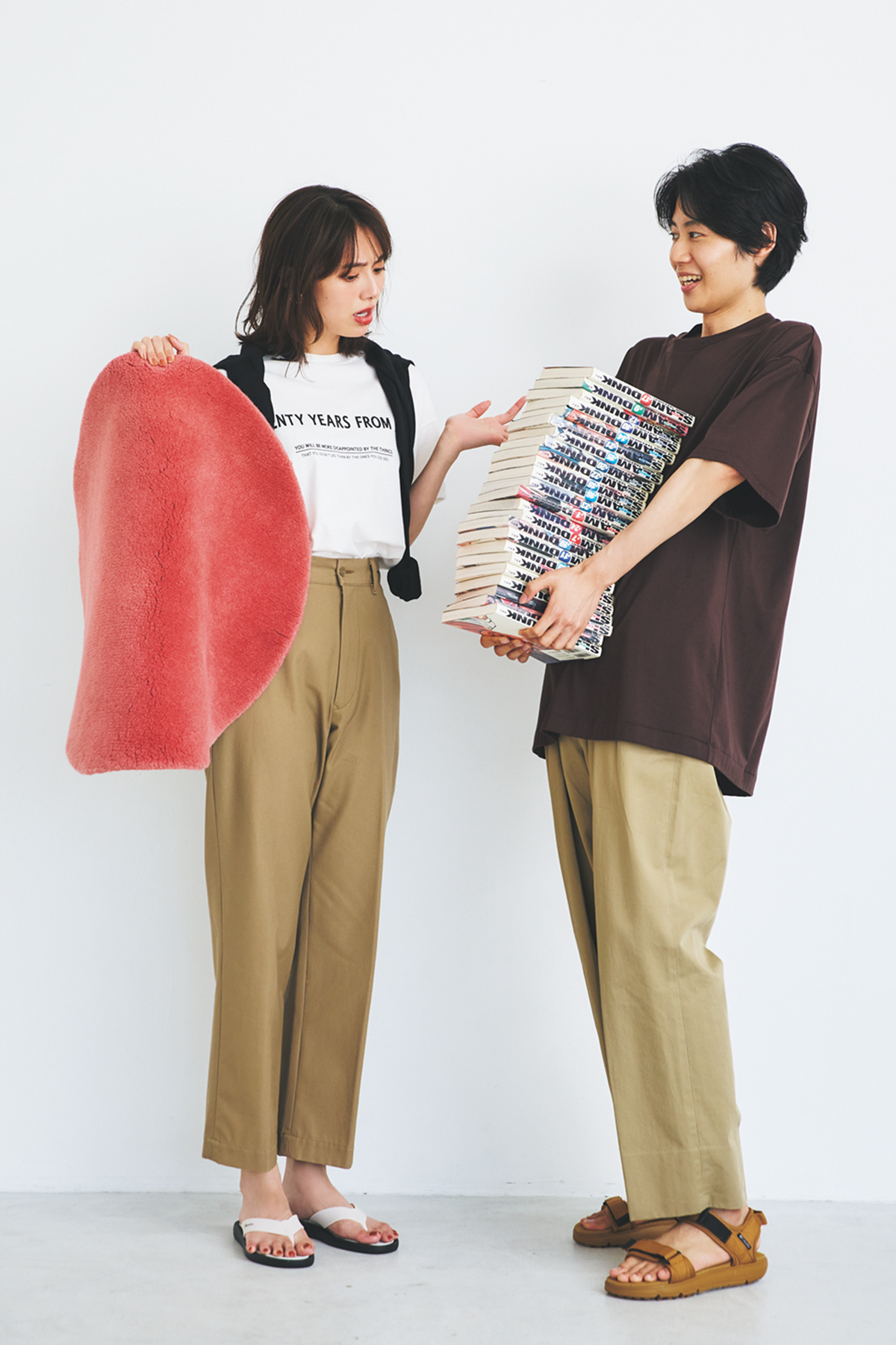 休みを合わせて大型家具店にお買物に来るのも新婚の醍醐味!少しずつ集めていこうね。[はずき]ショルダーバッグ¥34,100(アタオ/スタジオアタオ)かごバッグ¥16,500(ケッシュ ル エッセンシャル)ストール¥30,800(アソース メレ/アイネックス)ピアス¥7,700(アビステ)ネックレス¥8,800ブレスレット¥6,600(ともにエイチアッシュ/フォーティーン ショールーム)[リョーヘイ]サンダル¥20,900(ビルケンシュトック/エム)シャツ¥23,100スラックス¥30,800(ともにコロン/エンメ)メガネ¥40,700(アイヴァン/アイヴァン 東京ギャラリー)