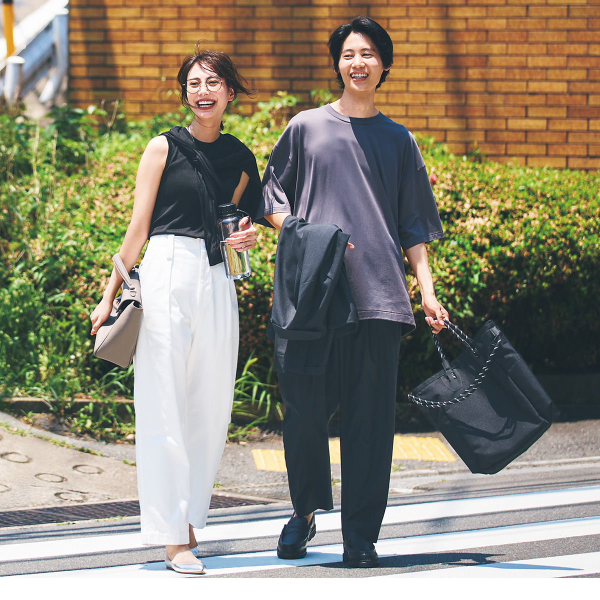 2人でモノトーンのオフィカジで統一して、駅まで一緒に。長袖カーディガンは冷房対策になるから、真夏でも重宝するアイテム。[はずき]バッグ¥56,100(ヴァジック/ヴァジックジャパン)パンプス¥28,600(ファビオ ルスコーニ/ファビオ ルスコーニ ルミネ有楽町店)メガネ8,800(ゾフ/ゾフ カスタマーサポート)[リョーヘイ]Tシャツ¥13,200シャツ¥42,900スラックス¥39,600(すべてエイトン/エイトン青山)ローファー¥71,500(パラブーツ/パラブーツ青山)トートバッグ¥35,200(ニューライフプロジェクト/にしのや)