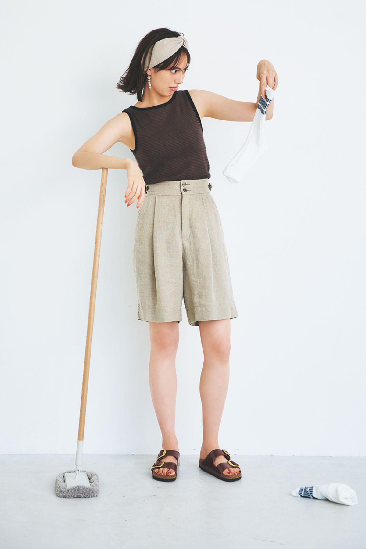 膝上丈のフレアタイプなら大人も穿きやすい。リネンベージュが爽やかな印象と着心地もお約束!¥27,500(ヤヌーク/カイタックインターナショナル) -
