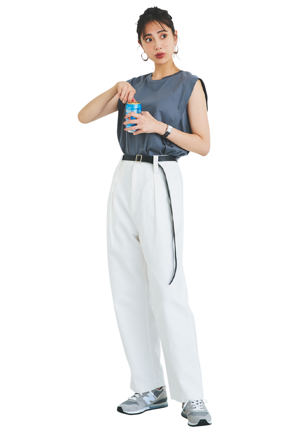 クリアな白がコーデをフレッシュに見せるタックパンツ。ハイウエスト&ワイドシルエットに注目して。¥34,100(RH ヴィンテージ/ロンハーマン) -