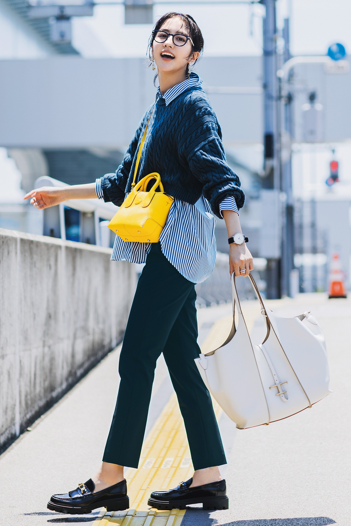 パンツ¥28,600(Theory/リンク・セオリー・ジャパン)ニッ¥19,800シャツ¥17,600(ともにエリオポール/エリオポール代官山)斜めにかけたバッグ¥261,800バッグ¥231,000ローファー¥106,700(すべてトッズ/トッズ・ジャパン)メガネ¥39,600(アイヴァン/アイヴァン 東京ギャラリー)ピアス¥7,150〈イン ムード〉時計¥51,700〈sazaré〉(ともにフォーティーン ショールーム)リング¥49,500(ジャッド ヴァンチュリ/アマン)
