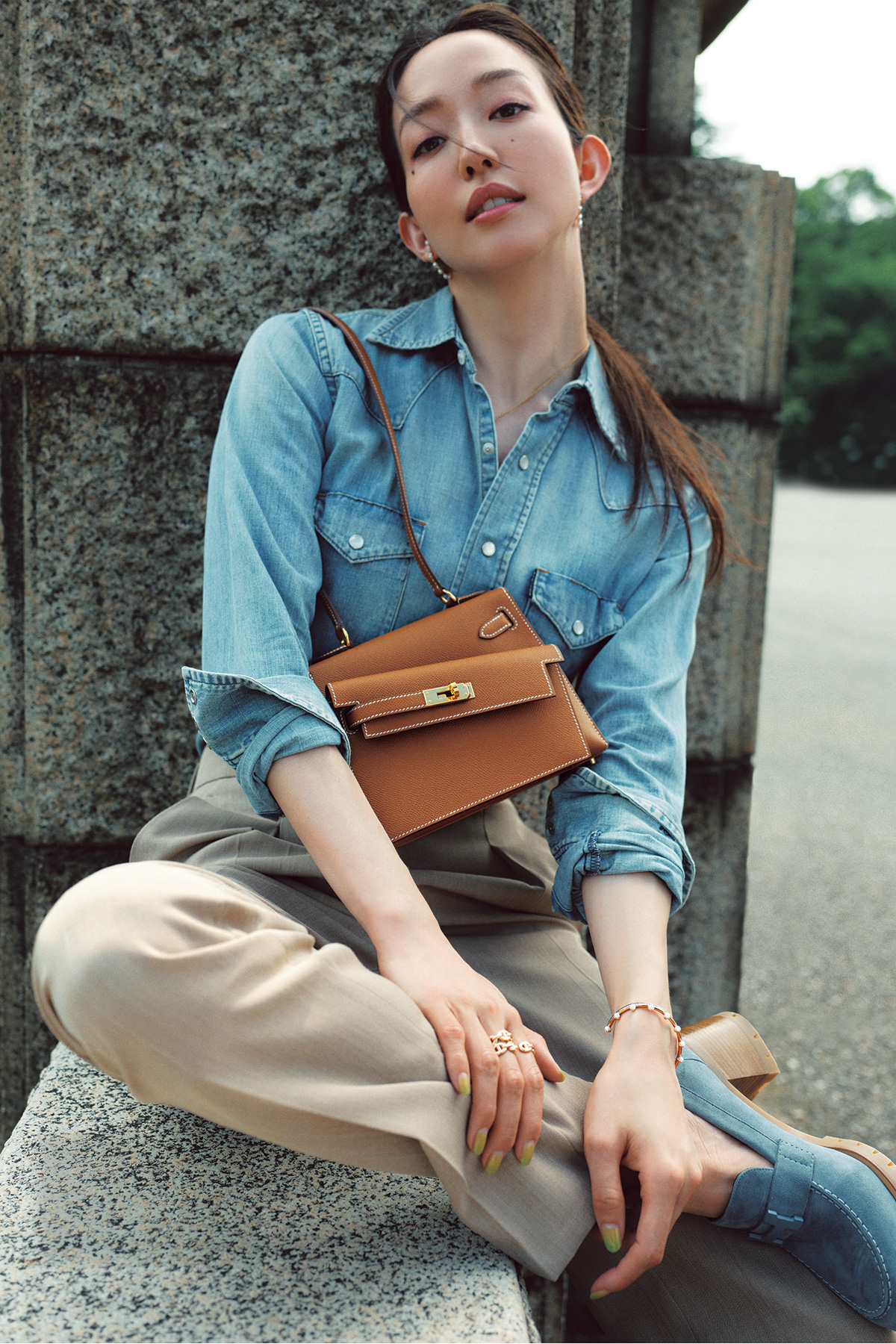 表と裏で表情の異なるアシンメトリーなバランスが新しい、「ケリー」の新作。ハンドルに変わる短めのバンドリエールで軽やかに纏える仕様で、今の時代をしなやかに生きる私たちにもぴったりです。バッグ「ケリーⅡ 無秩序」〈H17.5×W20×D9㎝〉¥1,661,000シューズ¥179,300ピアス¥1,243,000ネックレス¥781,000ブレスレット¥2,244,000リング¥858,000(すべてエルメス/エルメスジャポン)シャツ¥41,800(マディソンブルー)パンツ¥39,600(ebure/ebure GINZA SIX店)