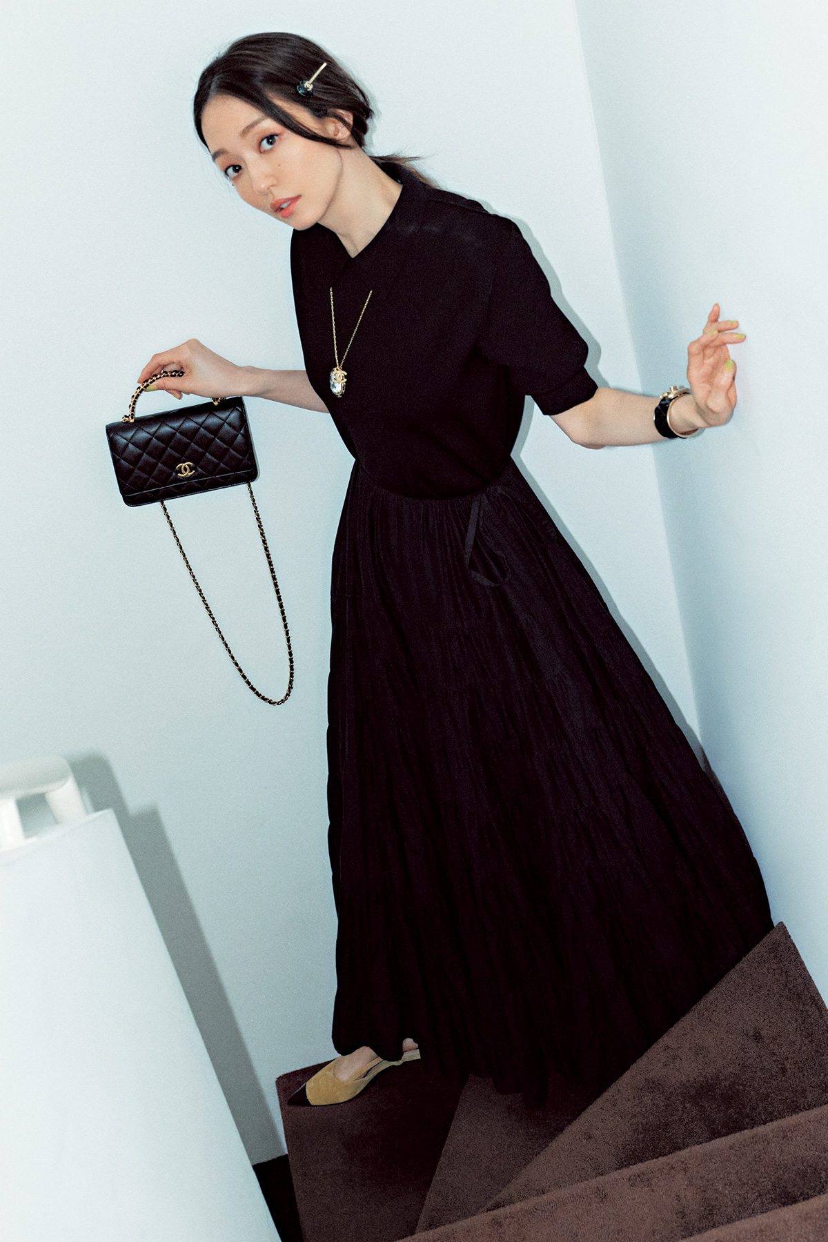 凛とした強さも華やかさも併せ持つ、シャネルのアイコン=キルティングバッグは、いつものモノトーンにときめきをくれる存在。未来の自分に投資する感覚で取り入れたい。ハートのヘアピンや、ネックレスにも注目。バッグ「O-MINI BAG」〈H12.3×W19.2×D3.5㎝〉¥530,200シューズ¥157,300ネックレス¥115,500バングル¥259,600ヘアピン¥69,300※以上すべて予定価格(すべてシャネル/シャネル カスタマーケア)ニット¥39,600(ルームエイト ブラック/ビームス ハウス 丸の内)スカート¥64,900(マーレット/サザビーリーグ)