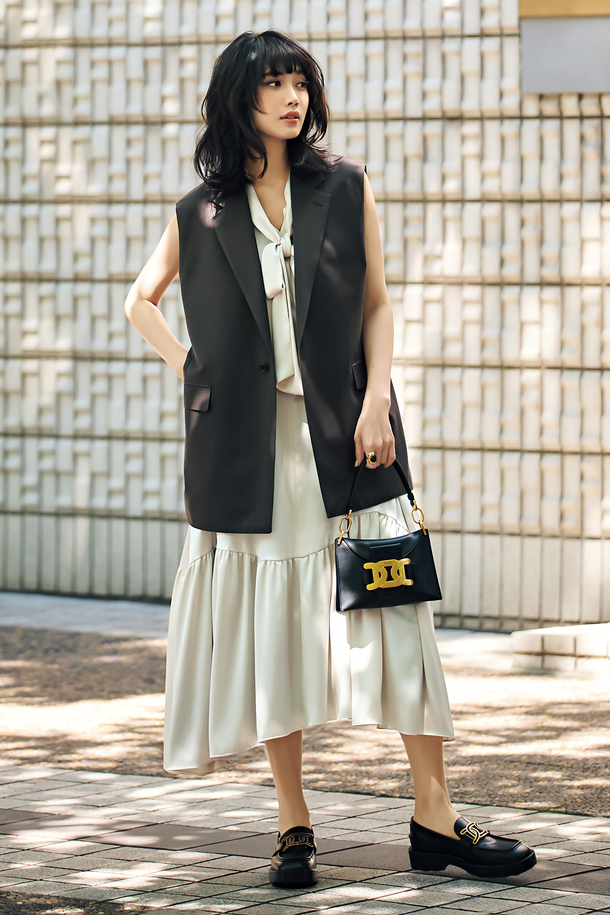 ダブルのテーラード風ジレのボタンを留めて、トップス気分でコーディネート。パンツだけでなくロングスカートとも相性◎。理想的な大人の甘辛バランスに。ジレ¥27,500(デミルクス ビームス/ビームス ハウス 丸の内)ノースリーブTシャツ¥9,900(スローン)スカート¥31,900(マリハ)バッグ¥16,500(アンドミューク/アマン)シューズ¥30,800(ファビオ ルスコーニ/ファビオ ルスコーニ ジェイアール名古屋タカシマヤ店)サングラス¥41,800(アイヴァン/アイヴァン 東京ギャラリー)ブレスレット¥6,300(アビステ)
