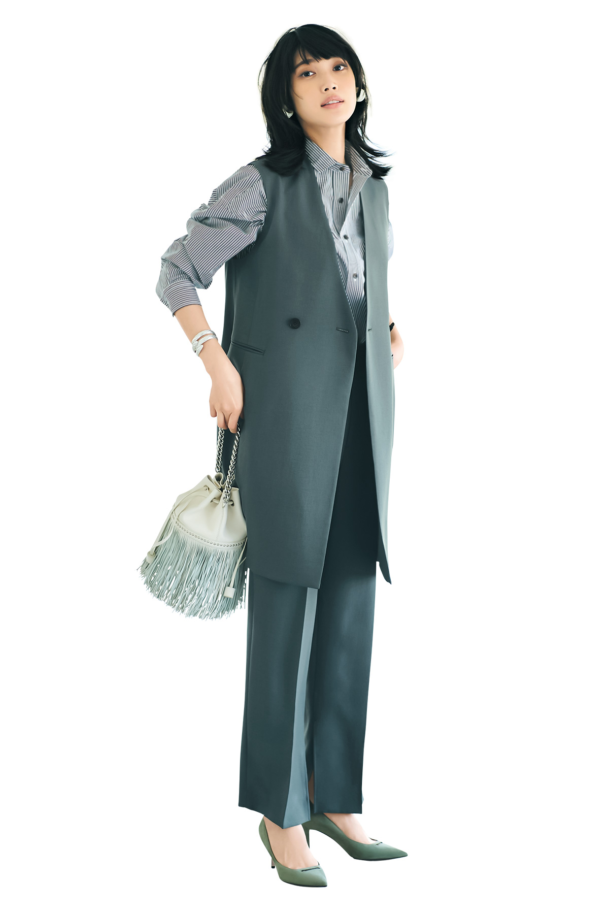 ジレのセットアップもいろんなブランドから登場しています。大人気のアンクレイヴなら、お手頃プライスで上下が揃う!ノーカラーと、少し上に付いたひとつボタンがすっきりスタイルUP。全体をワントーンでまとめることでさらにカッコよく。ジレ¥15,950パンツ¥15,950(ともにアンクレイヴ スタンダード/アンクレイヴ)シャツ¥24,200(ティッカ)バッグ¥156,200(J&M デヴィッドソン/J&M デヴィッドソン 青山店)パンプス¥52,800(ペリーコ/アマン)イヤリング¥12,600バングル¥4,320(ともにアビステ)