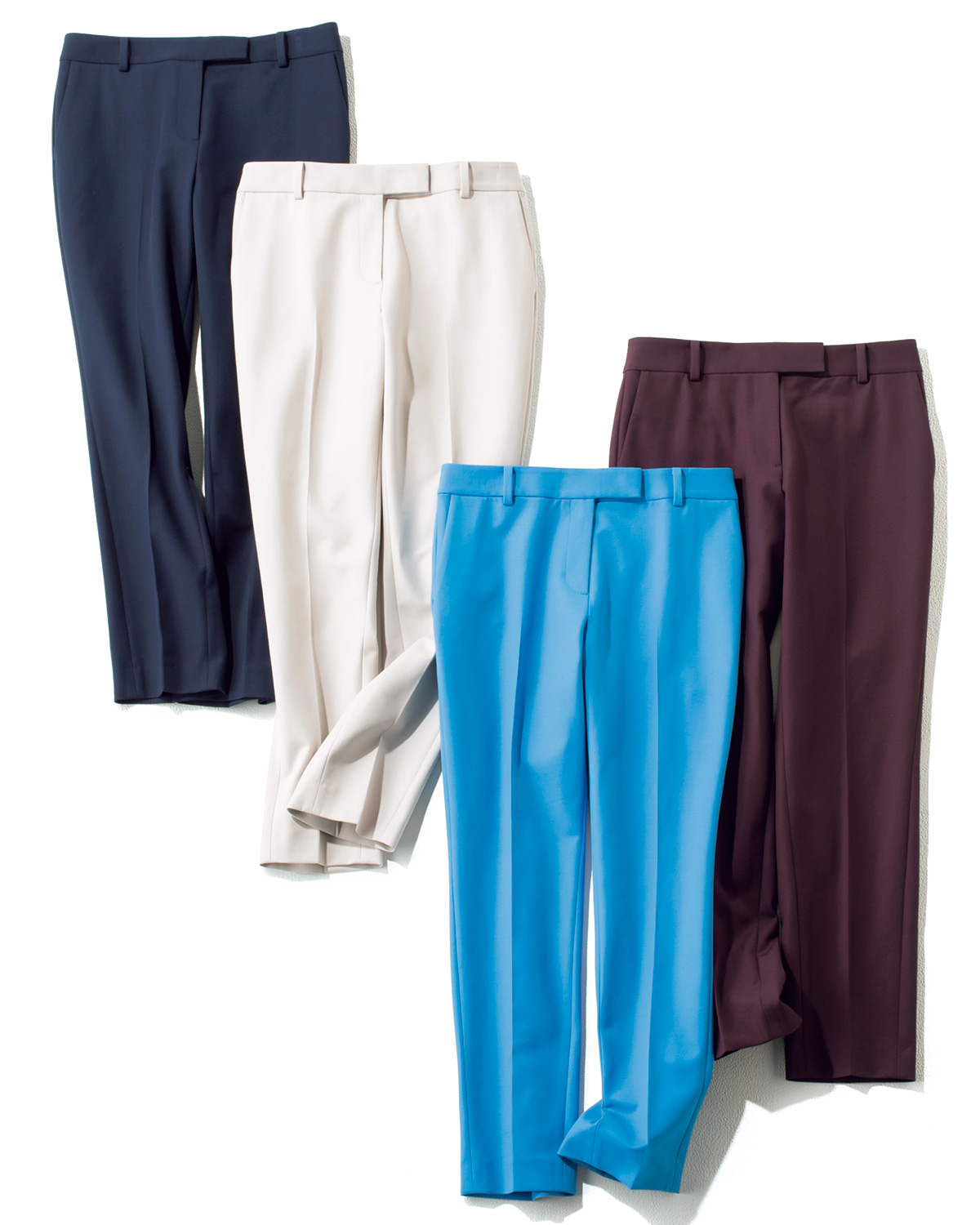 リーダーズに加え、CLASSY.スタッフもこよなく愛する名品。カラーバリエとサイズ展開(XXS~XXL)が豊富で、冬にはあったか素材、夏にはリネンブレンドと季節ごとの素材で発売。毎シーズン買い足す人もいるロングヒットパンツです。パンツ各¥8,990(すべてPLST)