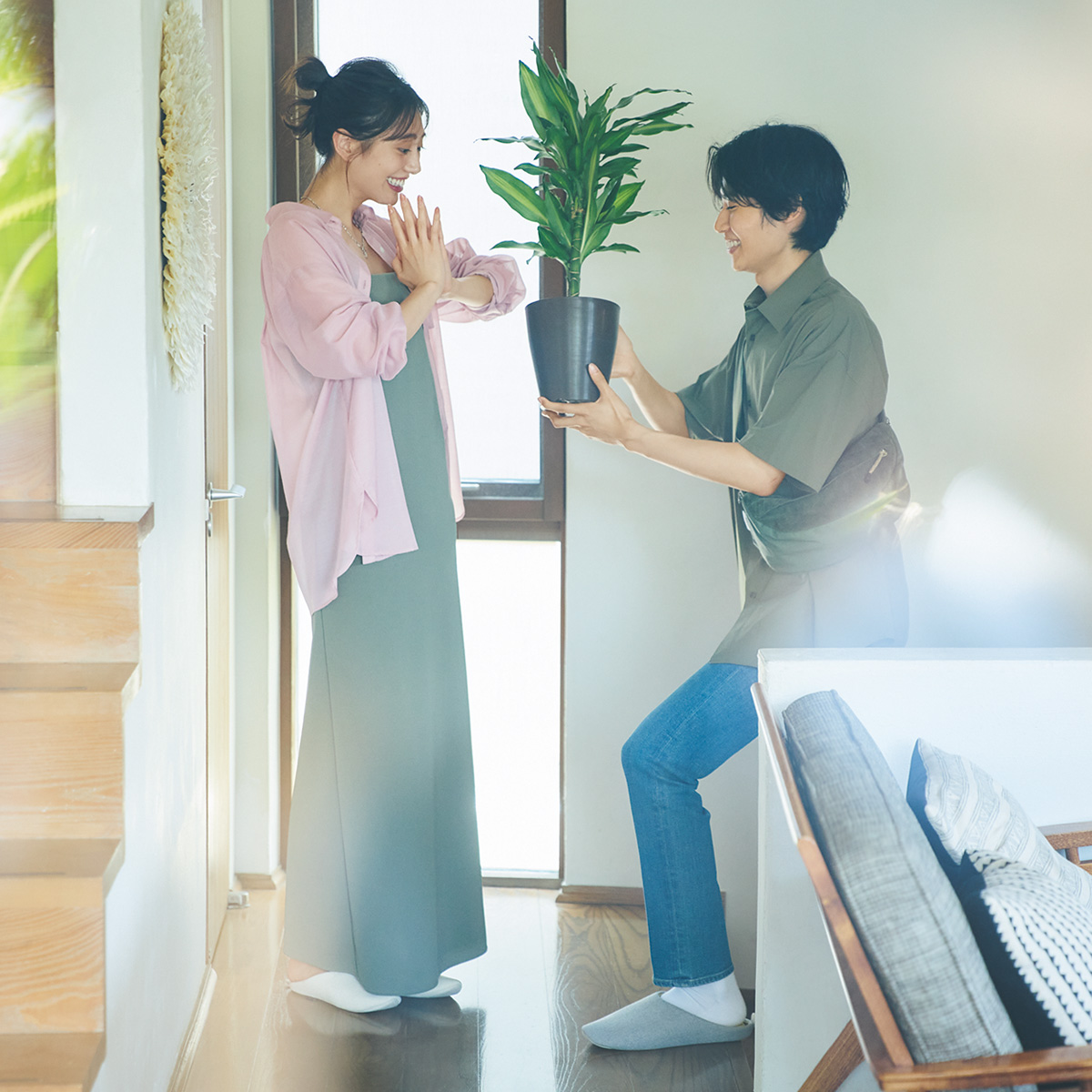 今までは記念日ディナーと花束をリクエストしていた私。今年はサプライズでグリーンをプレゼントしてくれた!「ずっと枯れないで育てられるものをプレゼントしたかったんだ」とリョーヘイ。意外とそんなロマンチックなところもあったんだね。ありがとう!すごくうれしいよ。[はずき]ネックレス¥19,800(ワームス/ワームス ルミネ新宿店)その他/スタイリスト私物[リョーヘイ]バッグ¥26,400(Sisii)シャツ¥13,200〈エバース〉デニムパンツ¥22,000〈ファクトタム〉(ともにSian PR)その他/スタイリスト私物