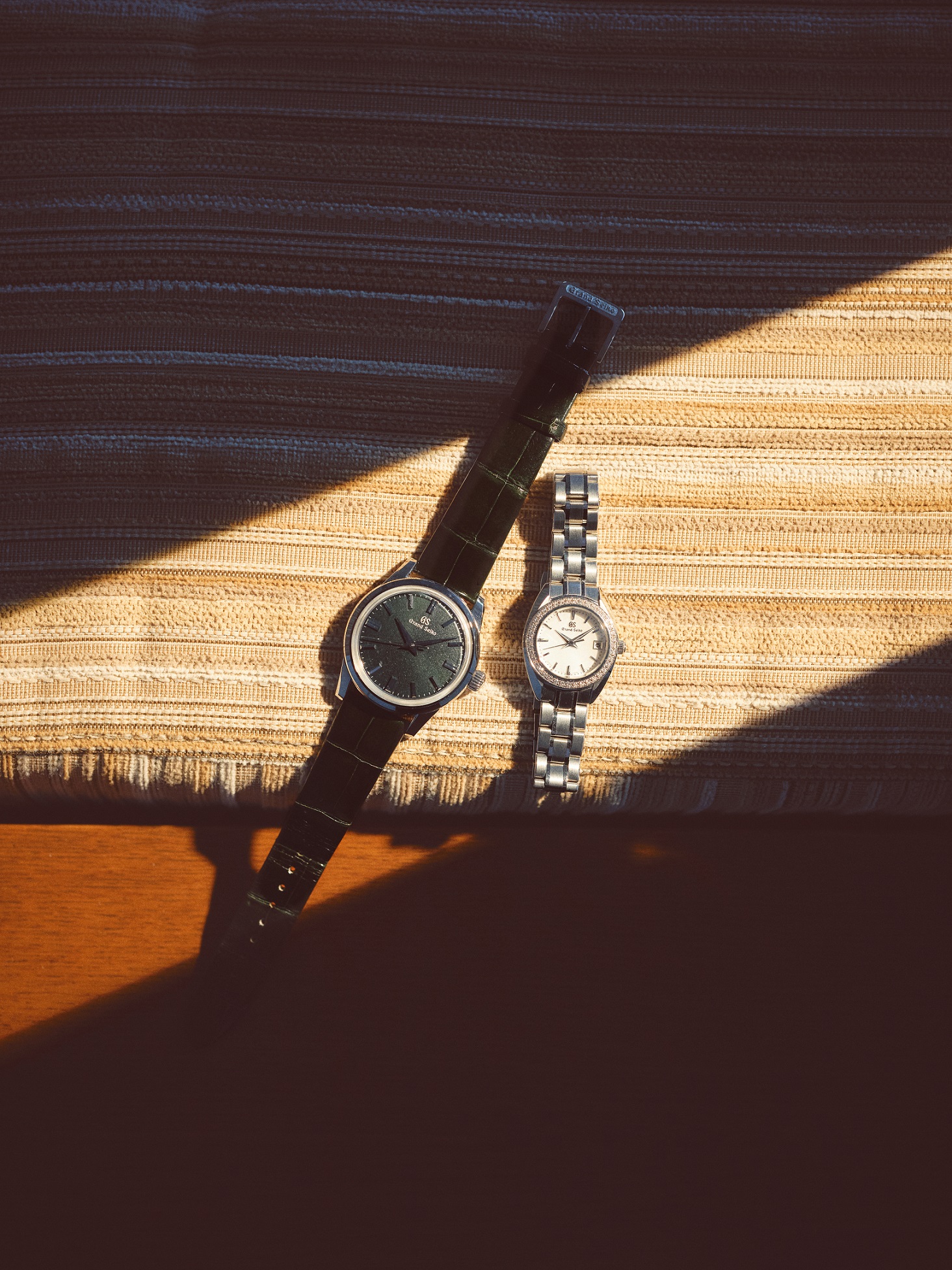 [左]夏から秋に移ろう季節を表す「杪夏(びょうか)」。そのネーミング通り、メカニカルモデルの製造地・岩手県雫石が夏の終わりを迎える頃の成熟した緑のカラーリングを表現。メンズライクなハンサムさで、ジャケットやジレの辛口コーデにもマッチ。時計「SBGW285杪夏」〈平均日差+5秒~−3秒/ステンレススティール,クロコダイル/ケース径37.3mm/手巻〉¥550,000[右]オンもオフも使いやすい小ぶりなサイズ感ながら、ダイヤルの白蝶貝とダイヤモンドの多彩な輝きで手元が華やぐモデル。幅広い世代が知っている確かなブランド力の時計を身に着けて“本当のいいものを知っている人”に。時計「STGF279」〈年差±10秒/ステンレススティール,ダイヤモンド/ケース径26.0mm/クォーツ〉¥583,000(ともにグランドセイコー/セイコーウオッチ お客様相談室)