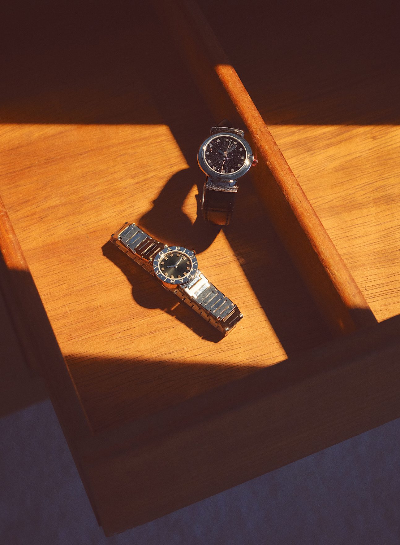 [左]古代ローマのコインにインスパイアされた「BVLGARI BVLGARI」のダブルロゴが象徴的なアイコンモデルが、日本女性のサイズ感に合わせて23mm径ケースで登場。光を受けて艶めくサテンラッカー仕上げのチャコールグレーのダイヤルで、モノトーンコーデからカラーコーデまで幅広くマッチ。時計「ブルガリ・ブルガリ」〈ステンレススティール,ダイヤモンド/ケース径23mm/クォーツ〉¥539,000[右]光を捉えて時間の経過を知らせる古代ローマの日時計へのオマージュを込めて誕生した「ルチェア インタルシオ」。透かし彫りの技法を駆使したダイヤルや手作業で精密に配されたマザーオブパールなど、ブルガリが誇る伝統的な職人技が光る名品ウォッチ。時計「ルチェア インタルシオ」〈ステンレススティール,ダイヤモンド,アリゲーターレザー/ケース径28mm/クォーツ〉¥704,000(ともにブルガリ/ブルガリ ジャパン)