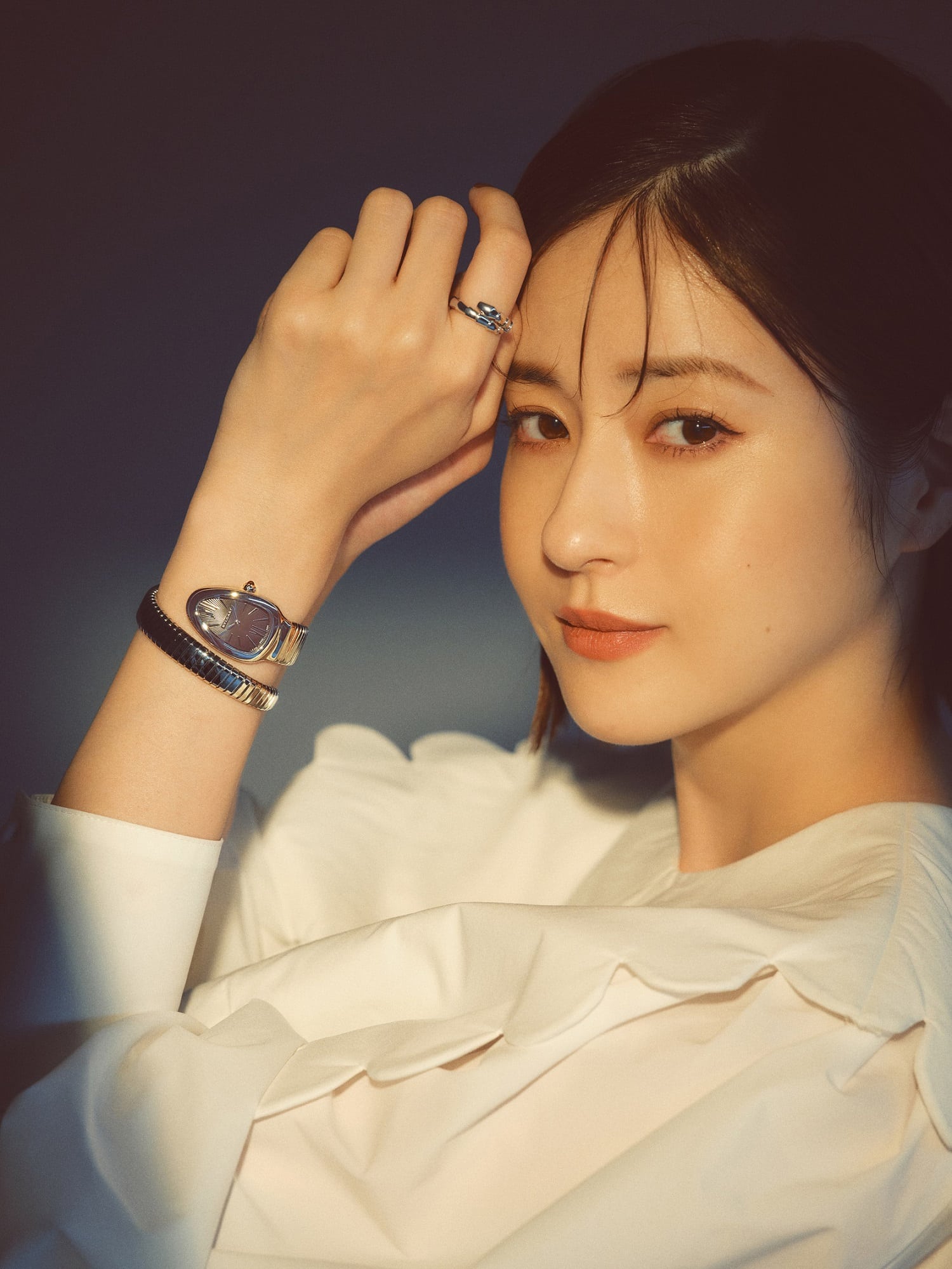 英知、生命力、永遠の象徴である蛇をモチーフにしたセルペンティコレクション。女性の手首に寄り添うトゥボガス ブレスレットのデザインは、1940年代後半から長く受け継がれてきたもの。時代を超越してきた伝統的なモチーフを選ぶことも、一生モノのタイムピースに出会う方法。ジュエラーならではの優美なシルエットとスタイリッシュな艶めきで、しなやかで芯のある理想の大人に近づけてくれる。時計「セルペンティ トゥボガス」<ステンレススティール/ケース35mm/クォーツ>¥759,000リング¥268,400(ともにブルガリ/ブルガリ ジャパン)ブラウス¥25,400(シーニュ)