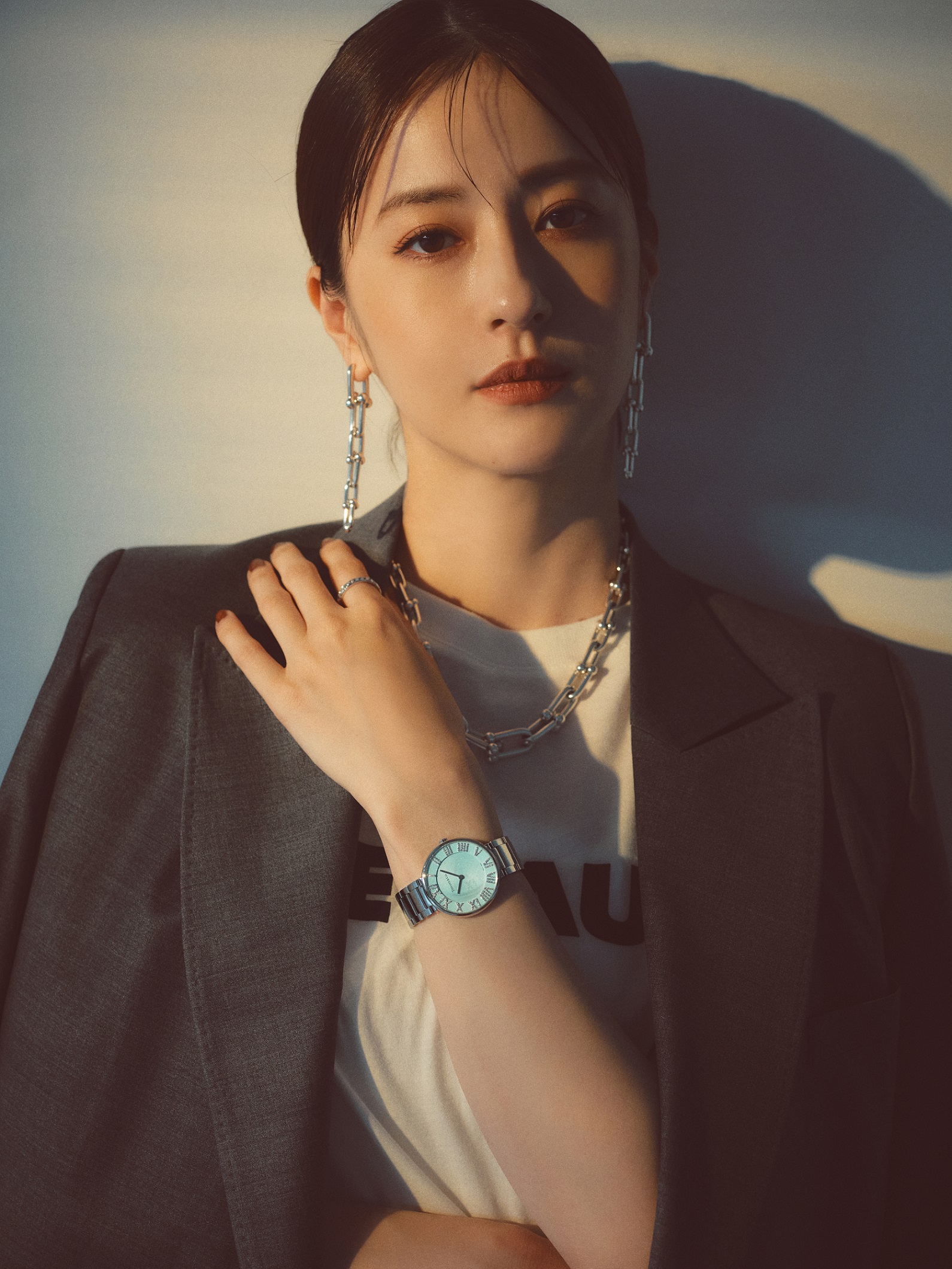 ティファニーの偉大なシンボルとして、NY5番街のティファニー本店のエントランスに掲げられているアトラス・クロック。「ティファニー アトラス」コレクションは、そのアトラス像から着想を得て1995年に発売。ダイヤモンドをセットしたローマ数字とティファニー ブルーのダイヤルのタイムレスさに加えて、軽やかな着け心地も長く愛せる所以。時計「ティファニー アトラス 34MM ウォッチ」〈ステンレススティール,ダイヤモンド/ケース径34mm/クォーツ〉¥913,000ピアス¥264,000ネックレス¥357,500リング¥158,400(すべてティファニー/ティファニー・アンド・カンパニー・ジャパン・インク)ジャケット¥74,800〈ウィム ガゼット〉Tシャツ¥7,150〈ザ・ポーズ〉(すべてウィム ガゼット ルミネ新宿店)