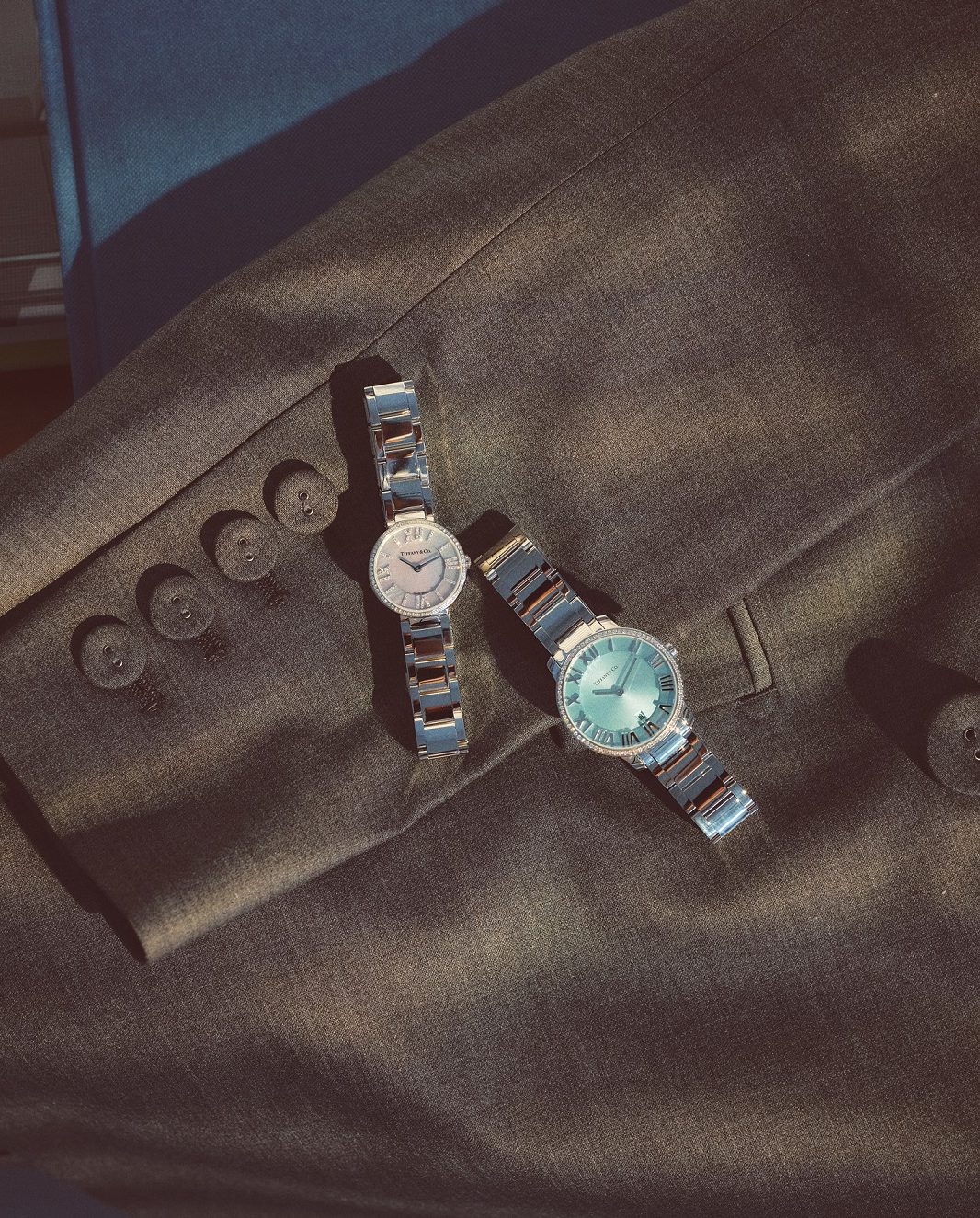 ラウンドブリリアントカットに研磨されたダイヤモンドが手元を動かすたびに美しく輝くベゼルダイヤモンドモデル。すっきりとしたローマ数字が醸し出すクリーンなムードで、ビジネスシーンでも好印象の手元に。[左]時計「ティファニー アトラス 2-ハンド 24mm ウォッチ」〈ステンレススティール,ダイヤモンド/ケース径24mm/クォーツ〉¥775,500[右]時計「ティファニー アトラス 2-ハンド 31mm ウォッチ」〈ステンレススティール,ダイヤモンド/ケース径31mm/クォーツ〉¥797,500(ともにティファニー/ティファニー・アンド・カンパニー・ジャパン・インク)