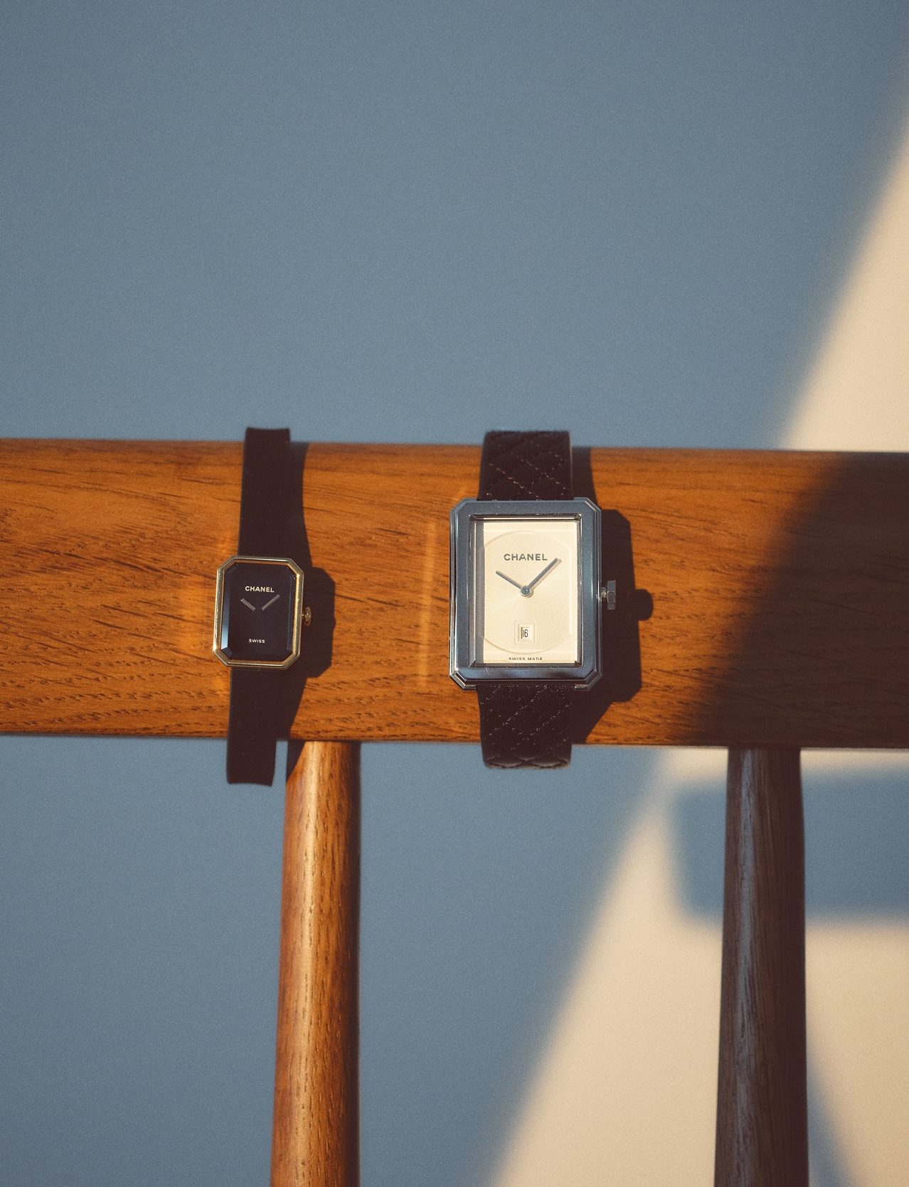 [左]1987年にシャネルが初めて発表した腕時計「プルミエール」。「プルミエール ヴェルヴェット」は初代モデル同様、パリのヴァンドーム広場と香水「シャネル N°5」のボトルストッパーをイメージした八角形ケースに、ベルベットタッチの細身のラバーストラップでモダンにアレンジ。上品さと女らしさを備えたデザインは、トレンドの甘口服のベストパートナー。時計「プルミエール ヴェルヴェット」〈イエローゴールド&チタン,ヴェルヴェットタッチラバーストラップ/ケース19.7 x 15.2mm/クォーツ〉¥632,500[右]端正な八角形のケースにふっくらとしたキルティングパターンのカーフレザーでメゾンのアイコンが詰まったデザイン。ステンレススティールにオパールホワイトのダイヤルを組み合わせたモノクロームの輝きは、時を経ても淘汰されない究極のエレガンス。大切に長く愛用して、次世代に受け継いでいきたい存在。時計「ボーイフレンド」〈ステンレススティール,キルティングパターンカーフスキンストラップ/ケース34.6×26.7mm/クォーツ〉¥599,500(ともにシャネル/シャネル カスタマーケア)