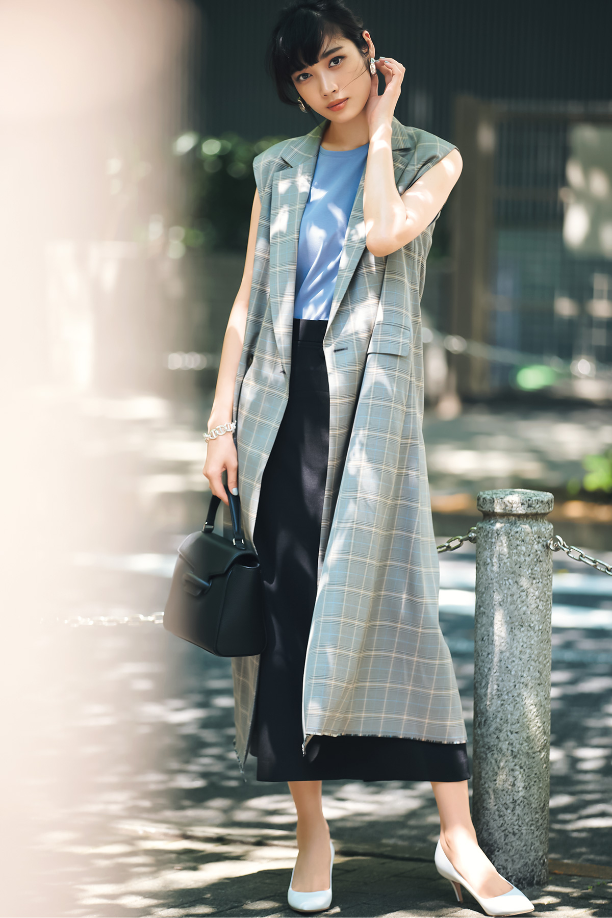 コンサバになりがちなタイトスカートも、ジレを重ねるだけで今っぽく印象チェンジ。ジレ¥97,900ノースリーブTシャツ¥11,000(ともにebure/ebure GINZA SIX店)スカート¥39,600(ハイク/ボウルズ)バッグ¥49,500(ヴァジック/ヴァジックジャパン)パンプス¥52,800(ペリーコ/アマン)ピアス¥35,200〈ウノアエレシルバーコレクション〉ブレスレット¥12,100〈ワンエーアールバイウノアエレ〉(ともにウノアエレ ジャパン)