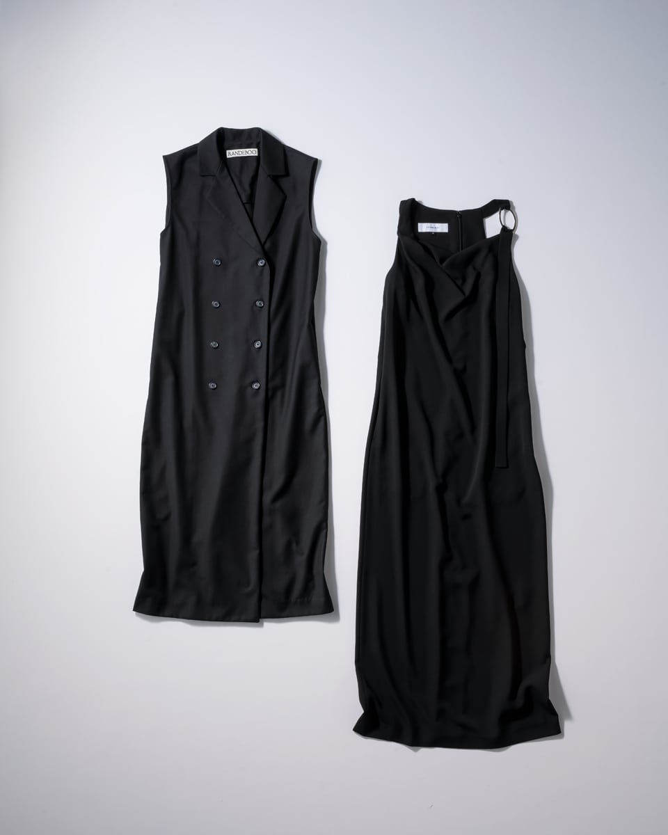 【左】ワンピとジレの2way仕様で、着回し力も優秀。ボディラインを拾いすぎないため、Iラインに抵抗がある人も挑戦しやすい! ワンピース¥20,350(RANDEBOO) 【右】アシンメトリーなカッティングとシルバー金具で、シンプルで終わらせないモードな一着。タンクやシアートップスとのレイヤードもおすすめ。ワンピース¥33,000(LE CIEL BLEU/ルシェルブルー 総合カスタマーサービス)