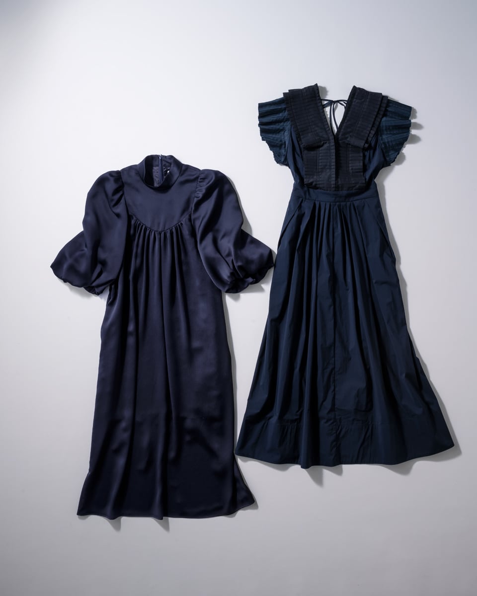 【左】美人度が増す、艶やかなサテン素材。ハイネックが甘さを抑えてモダンな雰囲気に導きます。フレアワンピース¥29,700(デミルクス ビームス/ビームス公式オンラインショップ) 【右】まるでミルフィーユのように、濃淡ネイビーのプリーツを重ねたデザイン。ウエストにはキュッとメリハリがあり、着るだけで女らしいシルエットを形成。ワンピース¥29,700(ELENDEEK)