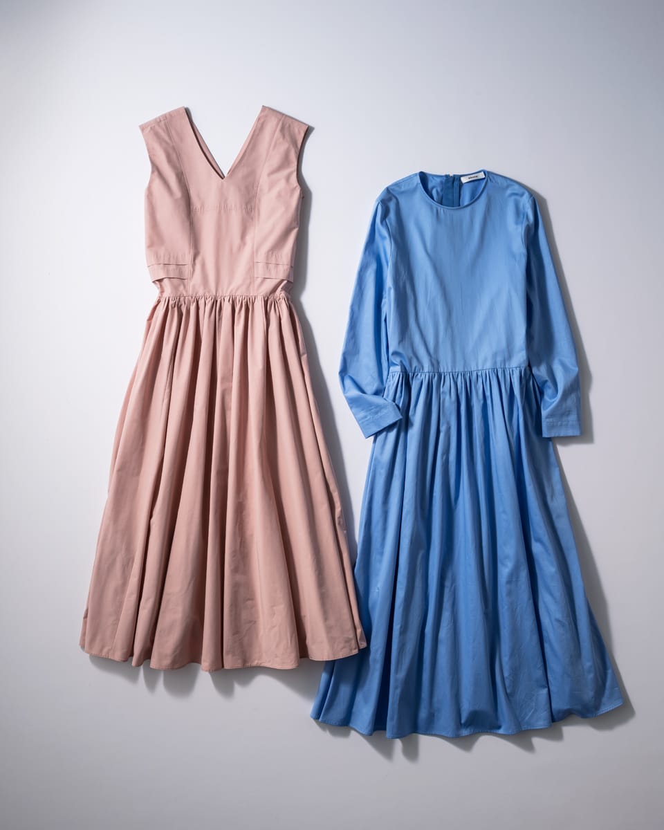 【左】自然な立体感のあるシルエットを形成する、ハリのあるコットンタフタ素材。前後ともにV空きのネックラインでさりげなく女らしさを。ワンピース¥16,500(SNIDEL) 【右】少し低めの位置で切り替えられた、リラックス感のあるデザインが新鮮。清々しいスカイブルーは、どんな場面でも好印象! ワンピース¥72,600(ebure/ebure GINZA SIX店)