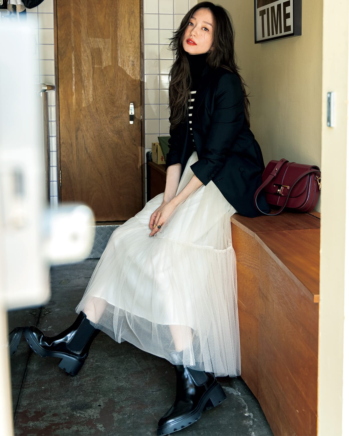 クリーンなシルエットですらっと見えるクラシカルな黒ジャケット。ボーダーニット×チュールスカートのパリっぽい着こなしも、可愛いだけじゃない、高感度な大人の装いに。ジャケット¥92,400(カオス/カオス表参道)ニット¥31,900(ユニオンランチ/サザビーリーグ)チュールスカート¥33,000(ユナイテッドアローズ/ユナイテッドアローズ 渋谷スクランブルスクエア店)グレームーンストーンリング¥165,000(マリハ)ブーツ¥106,700 バッグ¥300,300(ともにトッズ/トッズ・ジャパン)