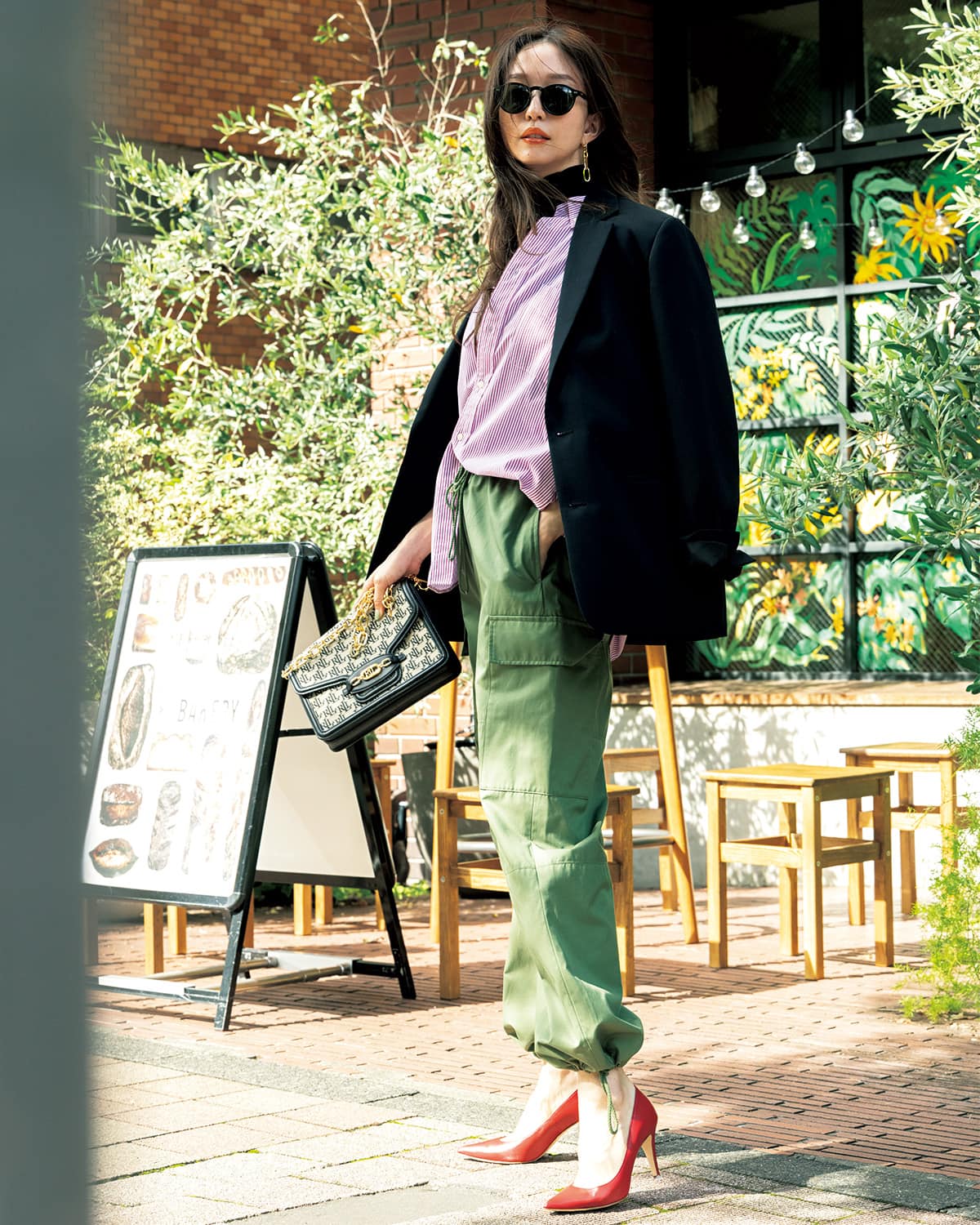 リラックス感が魅力のゆるパンツには相反するキレイめアイテムを合わせてハズしを効かせるのが洒落見えのカギ。カーゴパンツにジャケットをさらっと。その意外なバランスを楽しみたい。