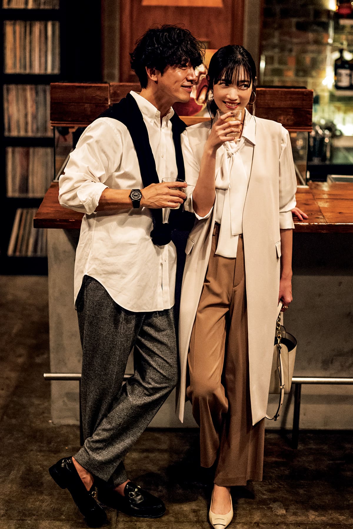 2軒目やデートの締めに寄りたい、センスのいいミュージックバーでは、ムードたっぷりの暗がりでも映える白トーンがレフ板効果を発揮。会話が音に消される接近戦に、白ジレが味方します。