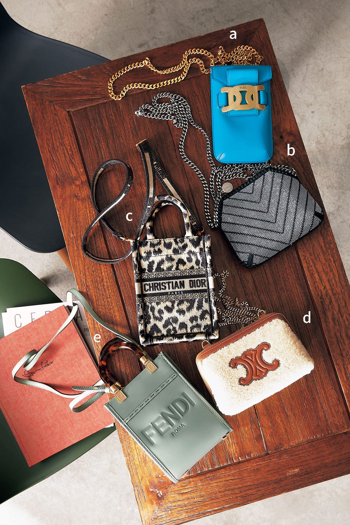 a.内側は滑らかなスエード素材、背面にはカードスロットが3枚あり。まさにお財布なしで出かけるのにぴったり。バッグ「トッズ ケイト モバイルフォンケース」〈H18×W11×D2㎝〉¥86,900(トッズ/トッズ・ジャパン)b.ファラベラのスマホサイズのバッグは、華やかなキラキラが女心にグッとくる!淡いピンクの裏地は、手にした人だけのハッピーな秘密。バッグ「ファラベラ」〈H15×W18.5×D5㎝〉¥139,700(ステラマッカートニー/ステラ マッカートニー カスタマーサービス)c.大人気の「ディオール ブック トート」がこんな愛らしいサイズに。〝ミッツァ〟と呼ばれるレオパード柄の刺繍は、秋冬コーデに映えること間違いなし。バッグ「ディオール ブック トート」〈H18×W13×D5㎝〉¥295,000(ディオール/クリスチャン ディオール)d.モコモコがたまらなく可愛いシアリングに、細いチェーンの組合せが贅沢。ファスナーはサイドまで開くので、出し入れしやすい構 造に。バッグ「キュイル トリオンフ クラッチ」〈H11×W16×D8㎝〉¥203,500 ※予定価格(セリーヌ バイ エディ・スリマン/セリーヌ ジャパン)e.シックなミントグリーンに、ステッチやべっ甲柄のハンドル…とリアルなトートバッグのミニチュア版に仕上げたような可愛らしさがポイント。バッグ「サンシャイン ショッパースモール」〈H18×W13×D6.5㎝〉¥209,000(フェンディ/フェンディ ジャパン)