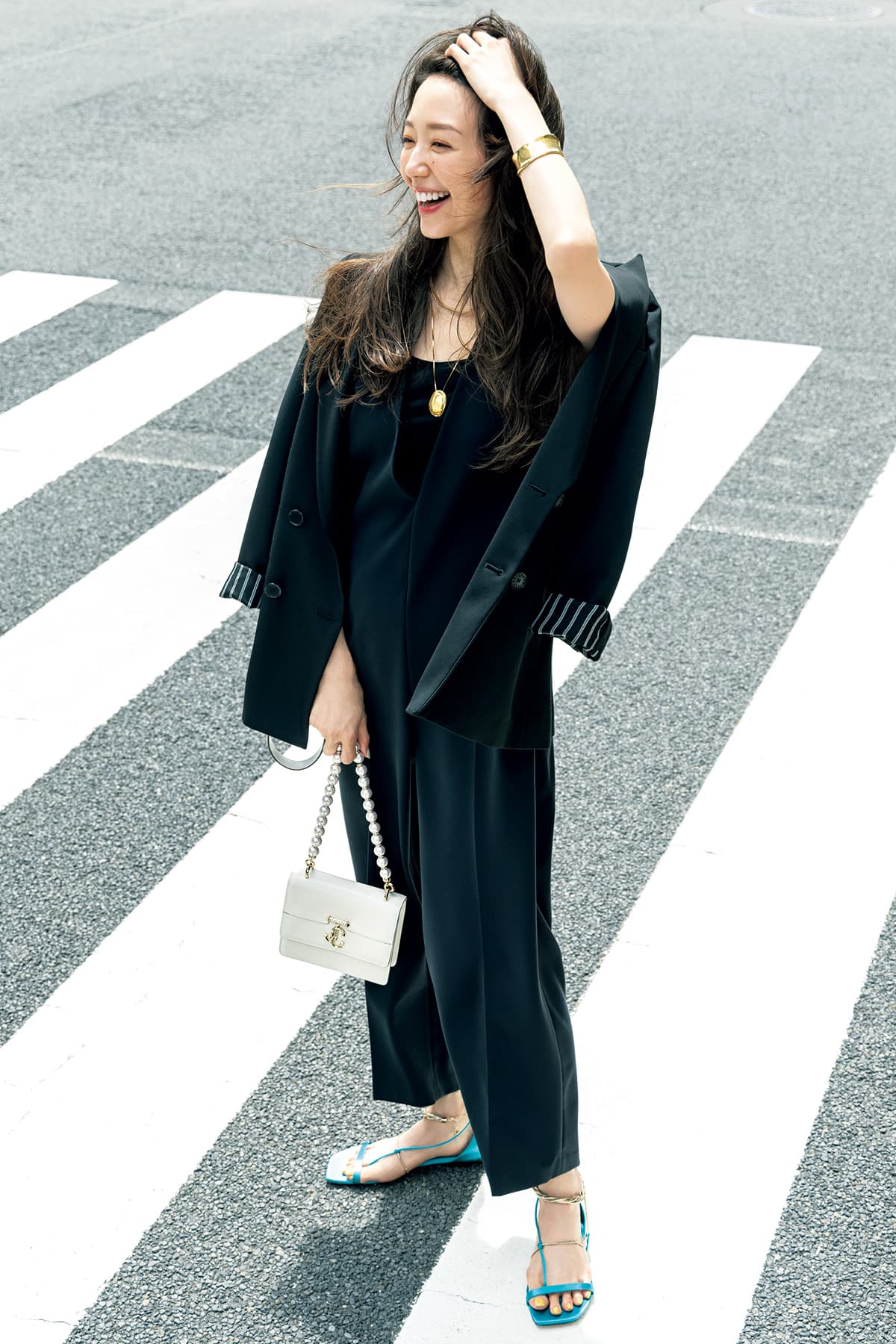 タキシード風デザインが、「きちんとしたい日」を盛り上げる。ジャケット¥55,000(アストラット/アストラット 新宿店)オールインワン¥28,600(ガリャルダガランテ/ガリャルダガランテ 表参道店)タンクトップ¥9,900(ebure GINZA SIX店)バングル¥55,000(シンパシー オブ ソウル スタイル/フラッパーズ)