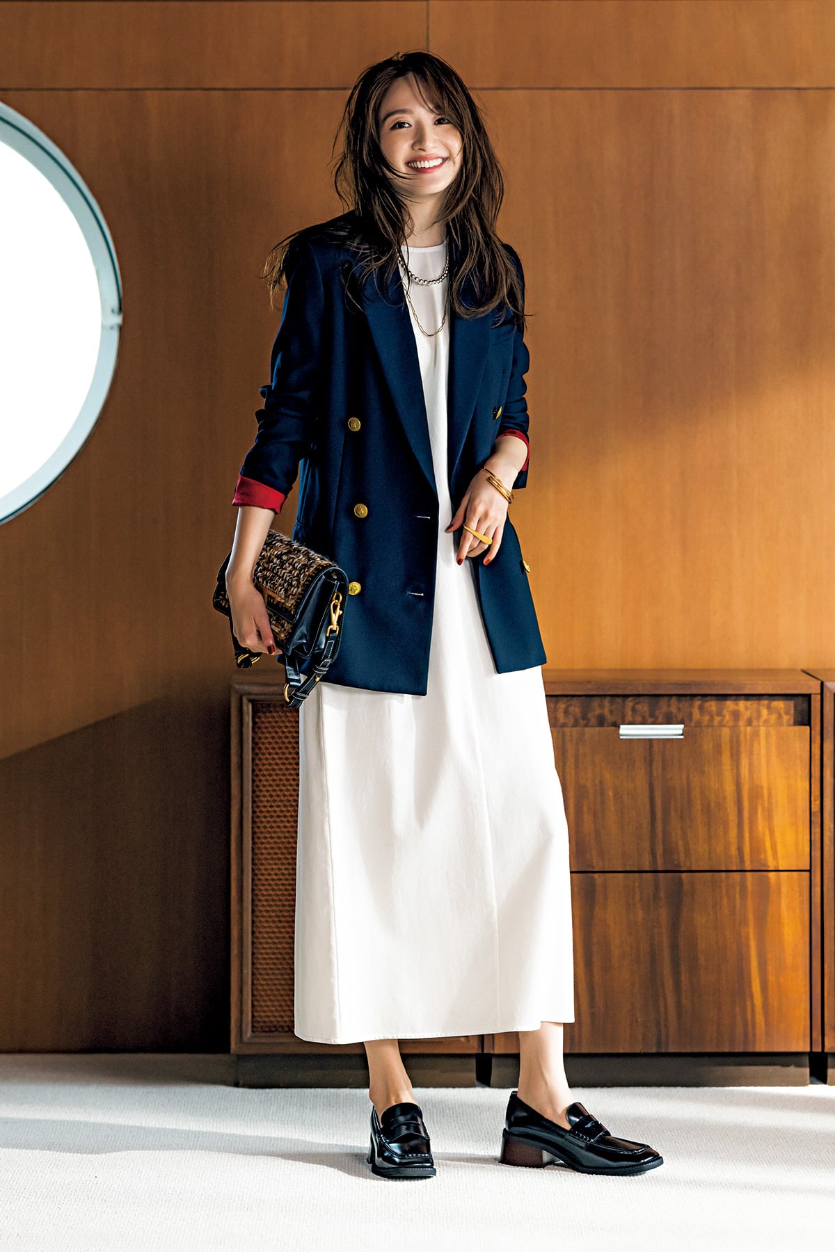 紺ブレと白のロングワンピというベーシックな組合せ&配色でも、Iラインの潔さでしっかり絵になる存在感。あえて盛らない、ミニマルシックな装いに。ジャケット¥105,600(マディソンブルー)ノースリーブワンピース¥33,000(BACCA/TOMORROWLAND)バッグ¥300,300ローファー¥100,100(ともにトッズ/トッズ・ジャパン)ボールチェーンネックレス¥35,640(アルポ/ZUTTOHOLIC)コンビチェーンネックレス¥36,300バングル¥72,600リング¥38,500(すべてリューク)
