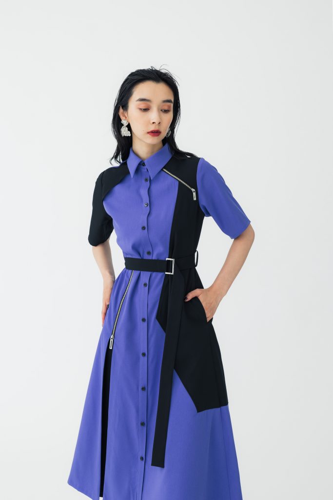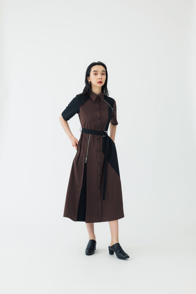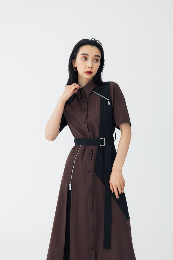 1枚でスタイルが完成する秘密は、3つのポリエステル素材を使用した表情のある生地づかい。ポイントにあしらわれた大きめのジップや裾にかけてのフレアシルエットも今年らしさ満点で、エレガントさとモード感を兼ね備えた印象が1枚で叶います。また、日本製ならではの技術で、立体的なシルエットを表現し、スタイルアップ効果もばっちり。さらに手洗い可能でシワにもなりにくく、季節を問わず着用できると推しポイントずくめ!
