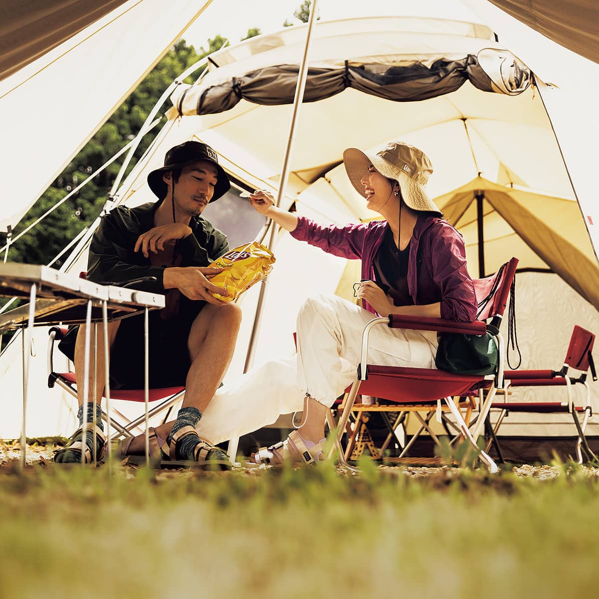 2人で力を合わせて、なんとかテントの設営完了!どちらが欠けてもダメ、そんな大変さも幸せ。とにかく動きやすさが大前提の本気キャンプは、自然の中で〝映える〞キレイ色の高機能服が正解。お揃いの帽子&足元もアウトドアから挑戦しよう。