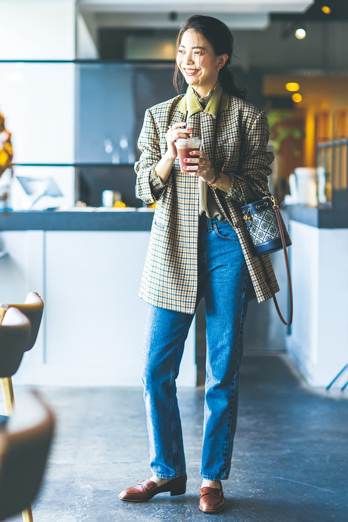 ファッション関係の方と近況をキャッチアップする日はこんなコーデで。チェック柄の長めボックスシルエットのジャケットに、バッグでさらに柄を重ねて。