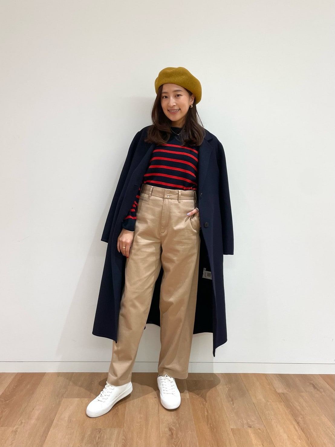 3Dボーダークルーセーター(長袖)¥3,990[Mサイズ着用]チェスターコート¥14,900[Mサイズ着用]チノワイドパンツ¥3,990[Mサイズ着用]ウールベレー¥1,990(すべてユニクロ/ イネス・ド・ラ・フレサンジュ[ユニクロ])キャンバススニーカー¥2,990(ユニクロ)