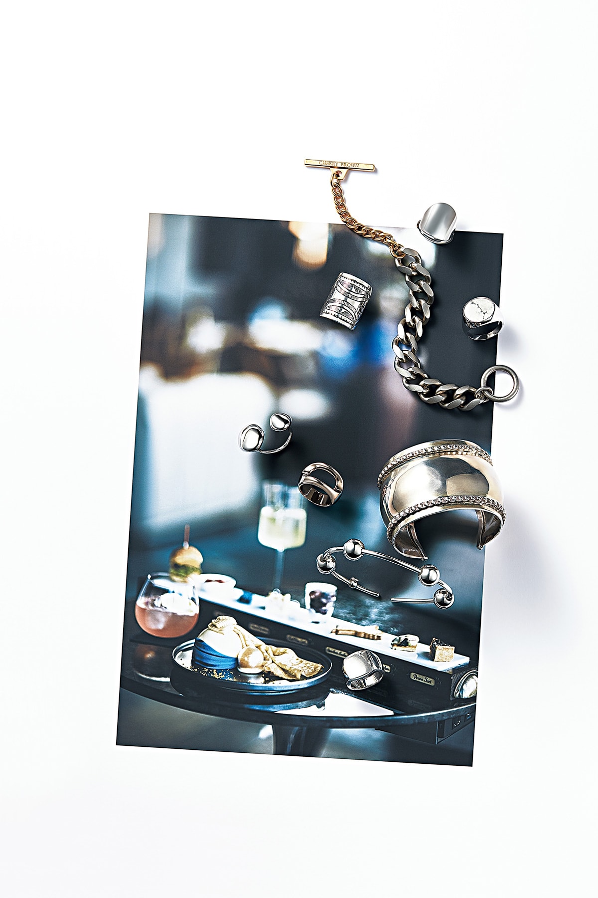 真珠の耳飾りやブルーのスカーフにマッチする、モードなシルバージュエリー。アーティストのアトリエがコンセプトのバー&ラウンジで美しいウォーターフロントの絶景とともに、ラグジュアリーなアート時間を満喫して。