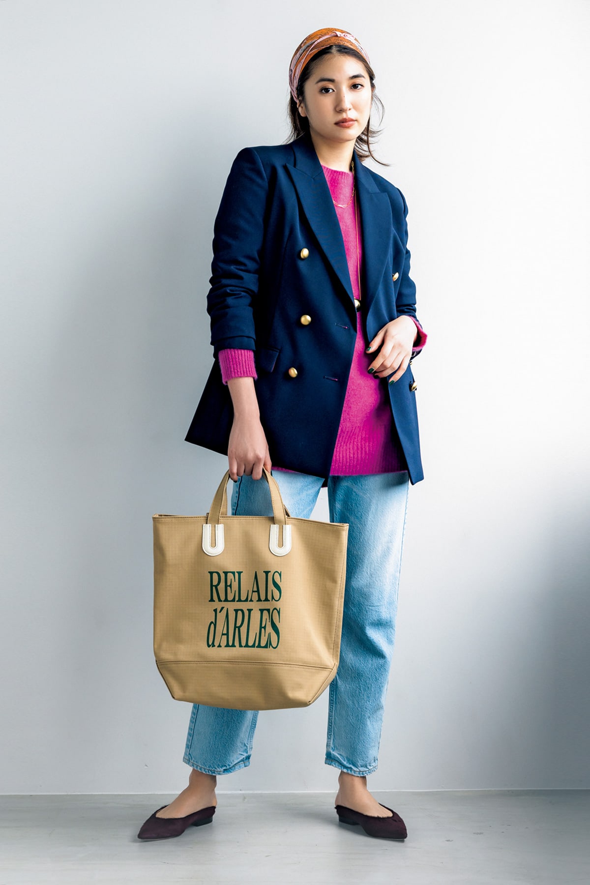 着慣れた紺ブレ×ブルーデニムの王道名コンビで、甘口ピンクもカジュアル路線へシフト。ジャケット¥46,200(アルアバイル/アルアバイル)ニット¥31,900(ティッカ)デニムパンツ¥25,300(アッパーハイツ×デミルクス ビームス/ビームス ハウス丸の内)スカーフ¥17,600(マニプリ)バッグ¥18,700(ノマディス/ユナイテッドアローズ 渋谷スクランブルスクエア店)パンプス¥60,500(ペリーコ/アマン)チェーンネックレス¥41,800(エム シースタジオ/ZUTTOHOLIC)ロングネックレス¥74,800(プラウ)