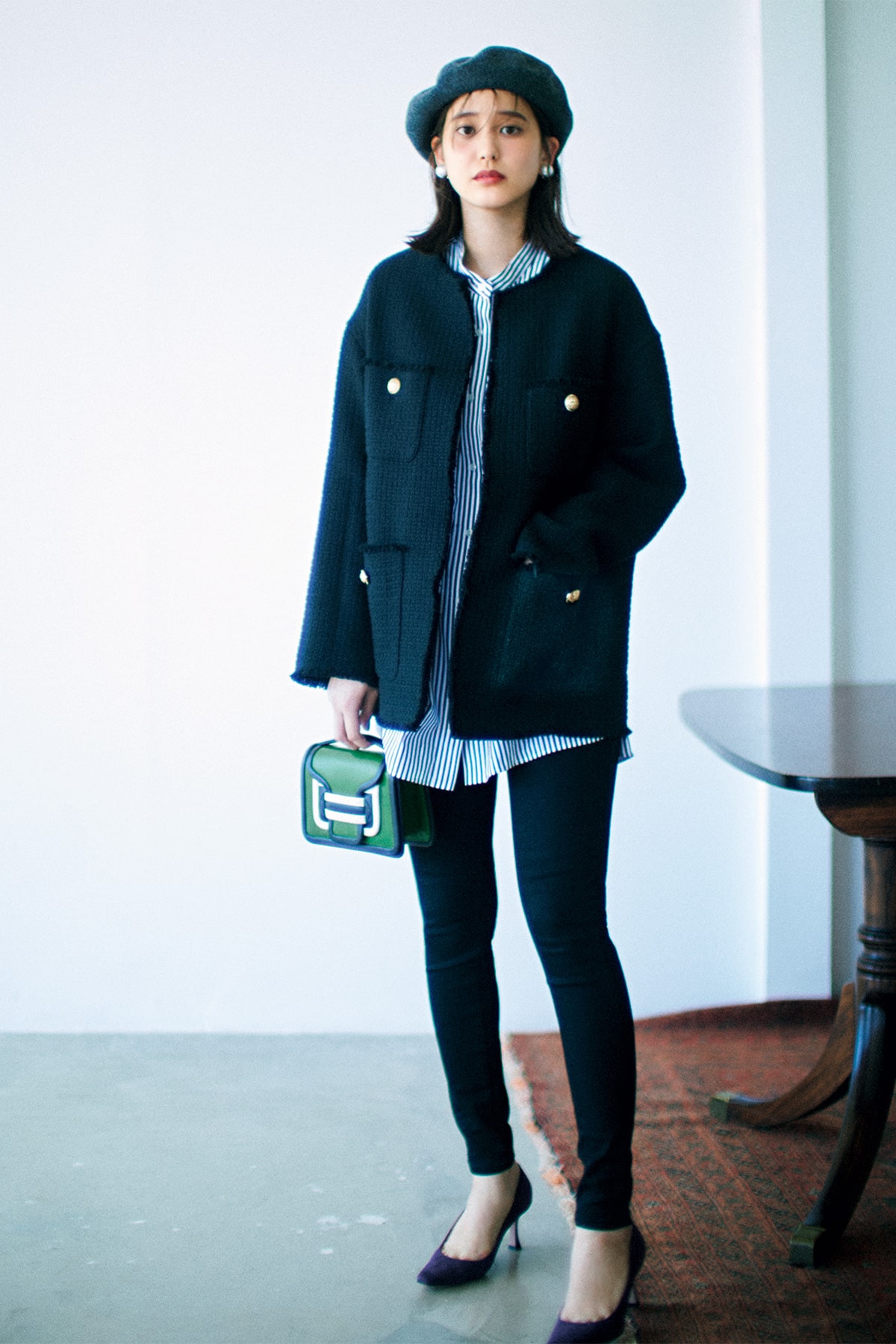 シックな佇まいでハンサムに着られる黒ツイードジャケット。かっちりしすぎない、ゆったりめのシルエットを選ぶのがこなれて見える秘訣です。インナーやボトムスなど、どこかに柄やキレイ色のアイテムを取り入れて、華やかに盛っても素敵。