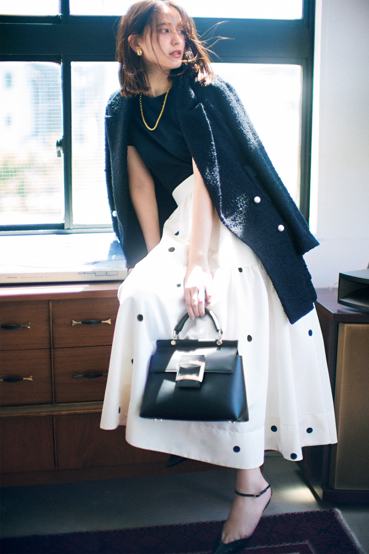 ツイードジャケット初心者でも、テーラード型ならコンサバになりすぎず取り入れやすい。ボリュームスカートにラフに肩がけして大人の余裕を漂わせて。ジャケット¥77,000(ANAYI)Tシャツ¥8,690(アルページュストーリー/アルページュストーリープレスルーム)スカート¥26,400(カデュネ/カデュネ プレスルーム)バッグ¥361,900(ロジェ ヴィヴィエ/ロジェ・ヴィヴィエ・ジャパン)パンプス¥53,900(ネブローニ/アルアバイル)ネックレス¥9,350(イン ムード/フォーティーン ショールーム)イヤリング¥5,670(アビステ)