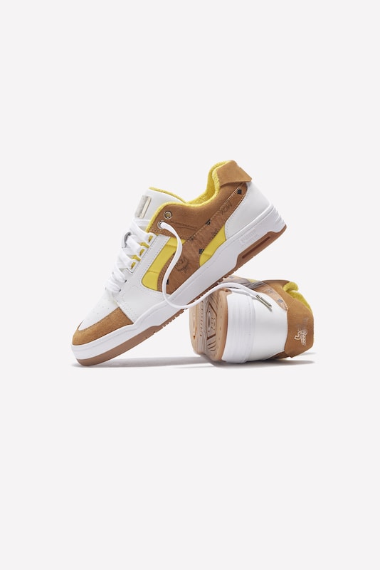 4年ぶりとなる今回のコラボレーションでは、1980年代に登場したバスケットボールシューズ「SLIPSTREAM LO(スリップストリーム ロウ)」をベースにしています。発売される「SLIPSTREAM LO MCM(スリップストリーム ロウ エムシーエム)」は、コート系シューズを独自のデザインでアレンジ。MCM の象徴であるコニャックカラーのヴィセトスモノグラムを、プーマの“フォームストリップ”に施しています。