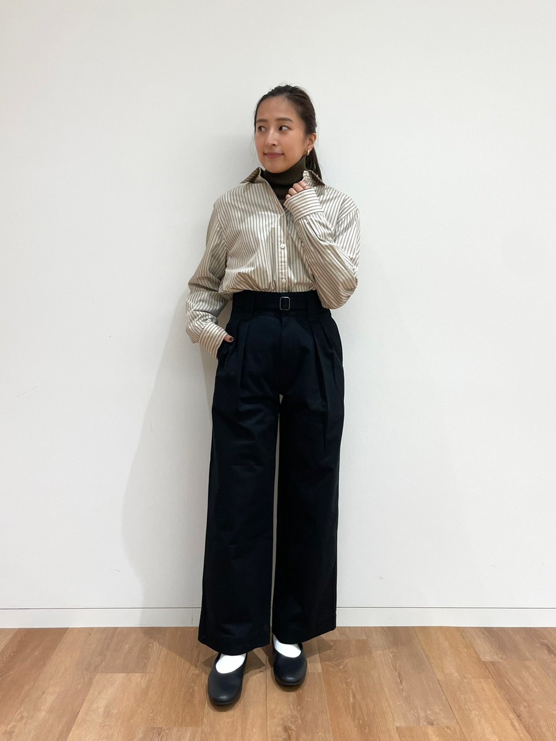マンネリしがちなシャツ×パンツコーデは、薄手のタートルニットを襟から覗かせるだけで、手の込んだスタイリングに。立体感が生まれるだけでなく、顔周りに華やかさが足されます。トップスをINしてパンツのベルトをキュッと締めれば、ウエストマークで細見え効果大。足元はバレエシューズからソックスを効かせると、大人可愛くまとまります。