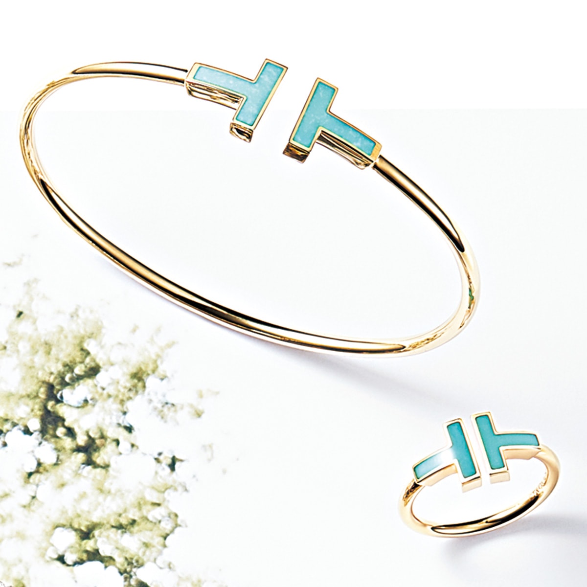 モダンなTに、ブランドのシグネチャーカラーを。「ティファニーT」ワイヤーブレスレット〈YG×ターコイズ〉¥335,500 ワイヤーリング〈YG×ターコイズ〉¥258,500(ともにティファニー/ティファニー・アンド・カンパニー・ジャパン・インク)