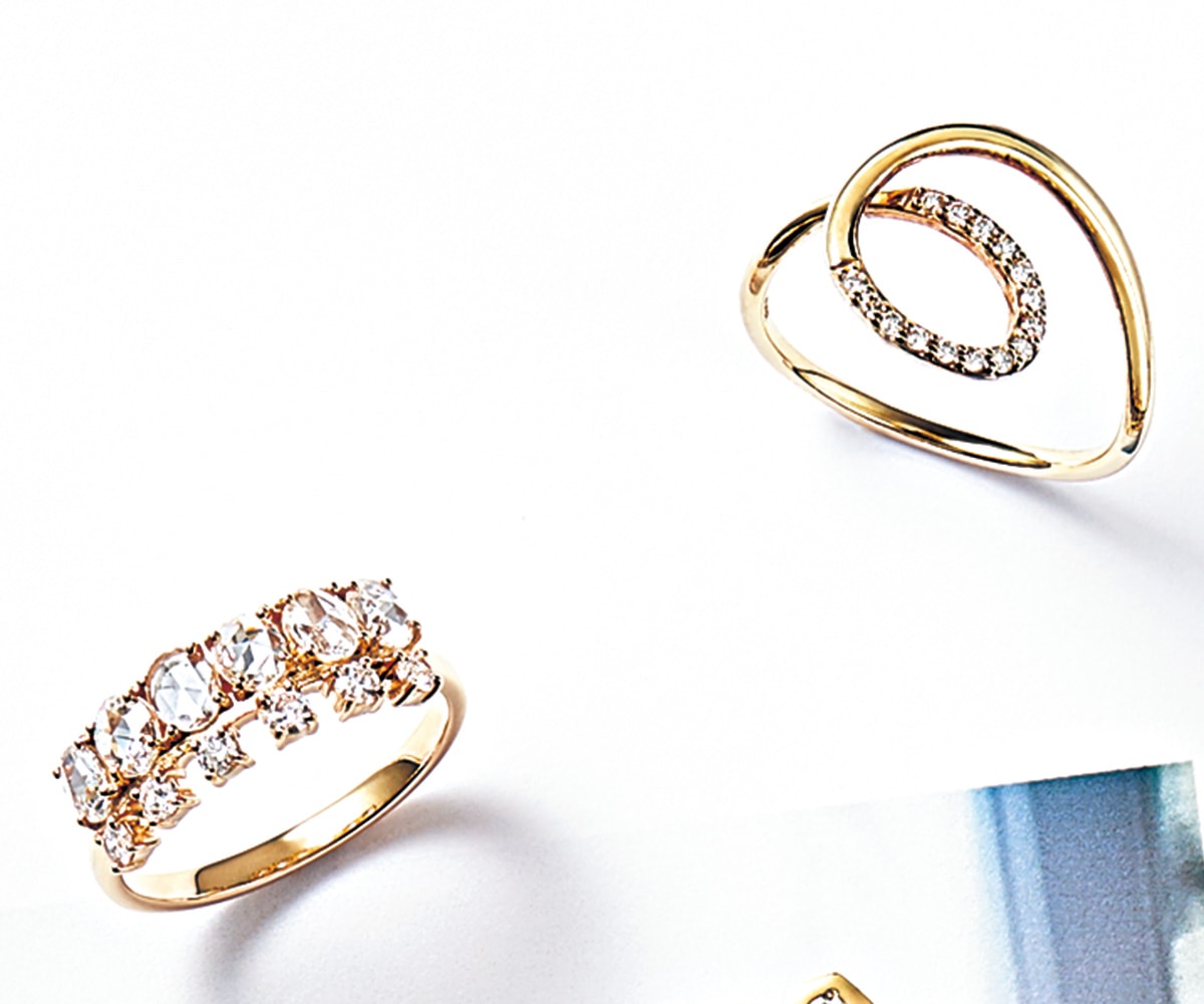 重ね付けも楽しい+1デザイン。リング¥25,300(4℃/エフ・ディ・シィ・プロダクツ)大小ダイヤモンドの眩い存在感。リング〈YG×D〉¥308,000(シンティランテ/イセタン サローネ 東京ミッドタウン)